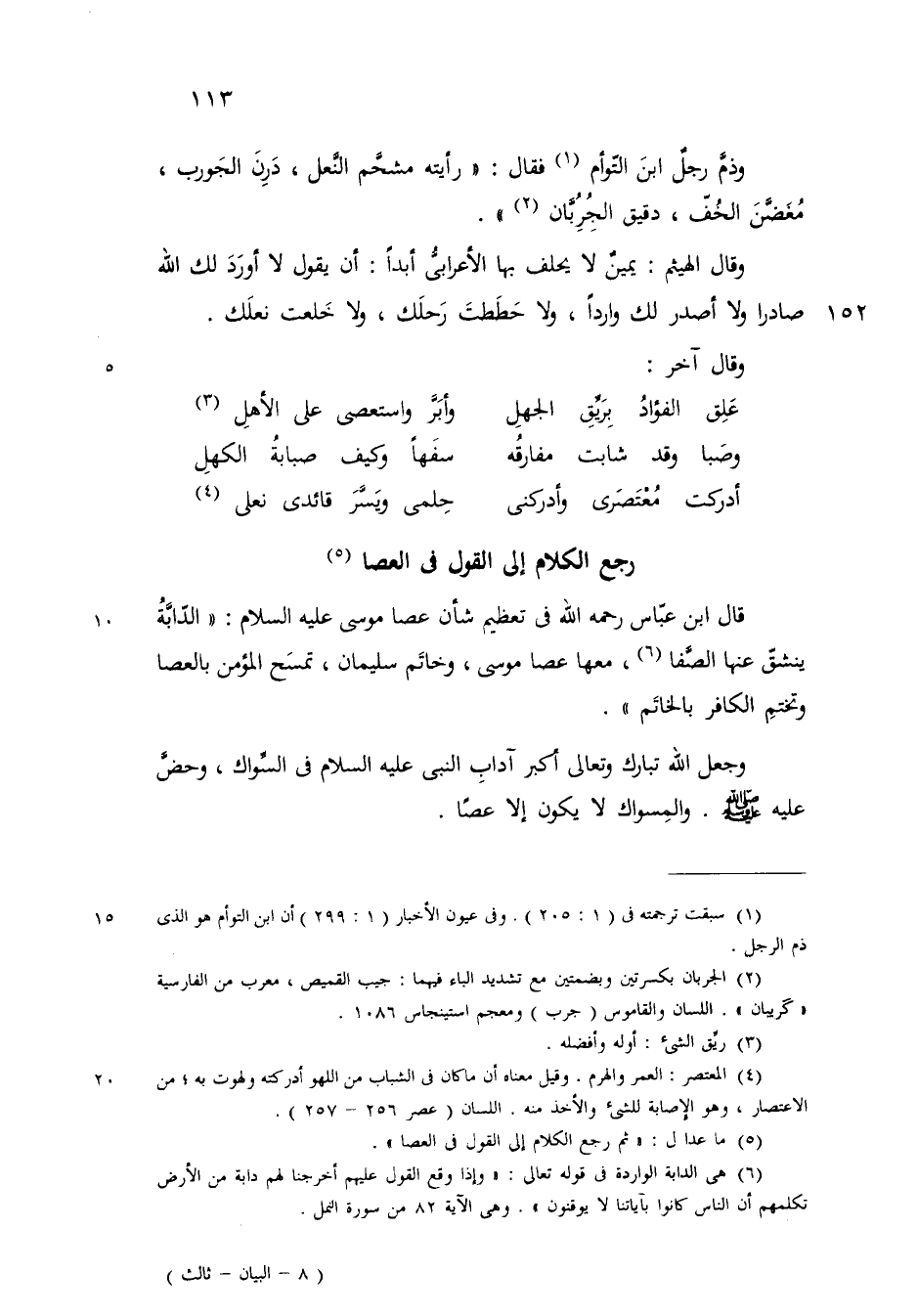 قال ابن عباس رضي الله تعالى عنهما في تعظيم شأن عصا موسى على نبينا وعليه السلام الدابة ينشق عنها الصفا معها عصا موسى وخاتم سليمان تمسح المؤمن بالعصا وتختم الكافر بالخاتم
