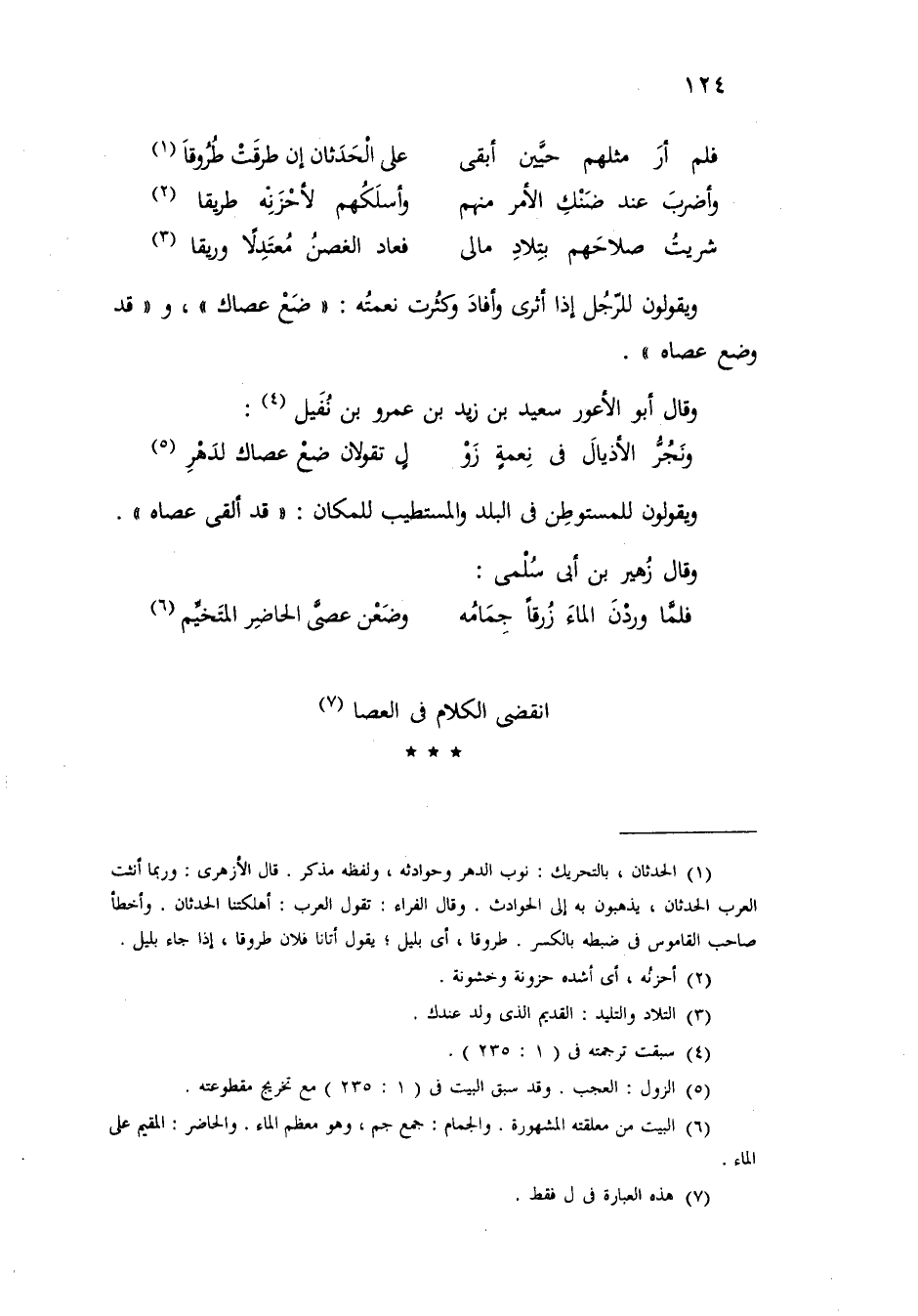 ويقولون للرجل اذا افاد وأثرى وكثرت نعمته ضع عصاك وقد وضع عصاه وقال ابو الاعور سعيد بن زيد بن عمرو بن نفيل