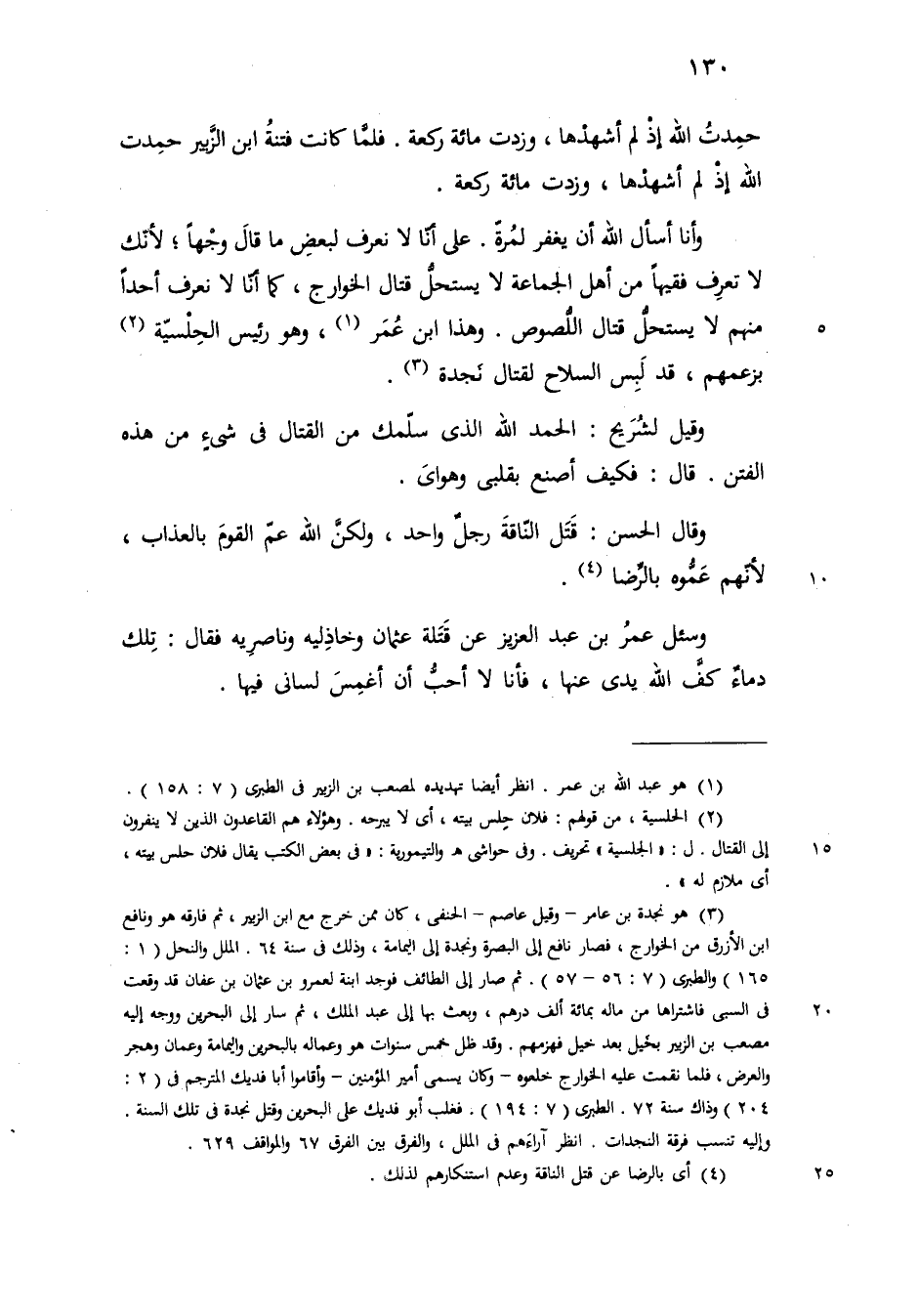 وأنا اسأل الله ان يغفر لمرة على أنا لا نعرف لبعض ما قال وجها لانك لا تعرف فقيها من أهل الجماعة لا يستحل قتال الخوارج كما انا لا نعرف أحدا منهم لا يستحل قتال اللصوص وهذا ابن عمر وهو رئيس الحلسية وزعيمهم قد لبس السلاح لقتال نجدة وقيل لشريح الحمد لله الذي سلمك من القتال في شيء من هذه الفتن قال فكيف اصنع بقلبي وهواي وقال الحسن قتل