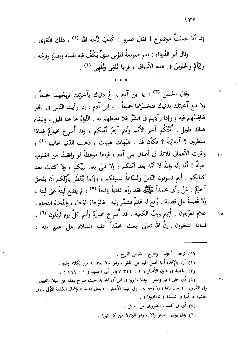 وقال الحسن يا ابن آدم بع دنياك بآخرتك تربحهما جميعا ولا تبع آخرتك بدنياك فتخسرهما جميعا يا ابن ادم اذا رأيت الناس في الخير فنافسهم فيه واذا رأيتهم في الشر فلا تغبطهم فيه الثواء ههنا قليل والبقاء هناك