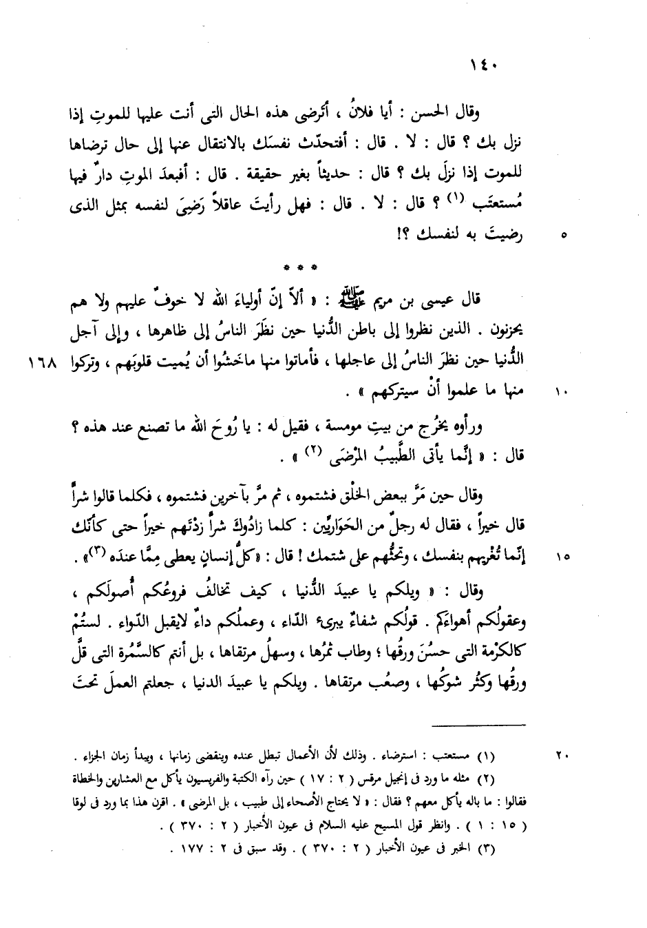 وقال الحسن أبا فلان اترضى هذه الحال التي انت عليها للموت اذا نزل بك قال لا قال أفتحدث نفسك بالانتقال عنها الى حال ترضاها للموت اذانزل بكقال حديثا بغير حقيقة قال أفبعد الموت دار فيها مستعتب قال لا قال فهل رأيت عاقلا رضي لنفسه بمثل الذي رضيت به لنفسك