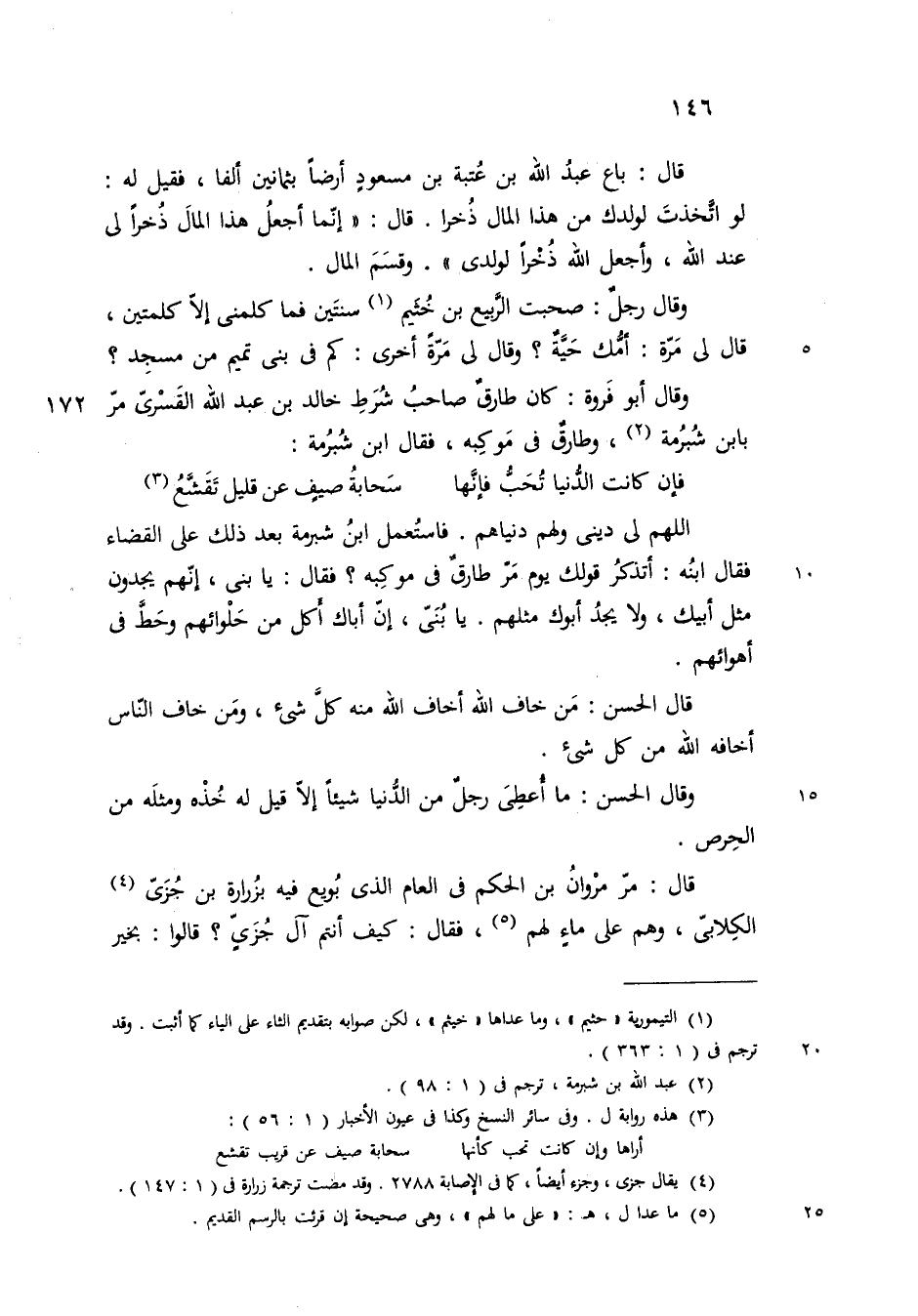 وباع عبد الله بن عتبة بن مسعود ارضا بثمانين ألفا فقيل له لو اتخذت لولدك من هذا المال ذخرا قال أنا اجعل هذا المال ذخرا لي عند الله وأجعل الله ذخرا لولدي وقسم المال