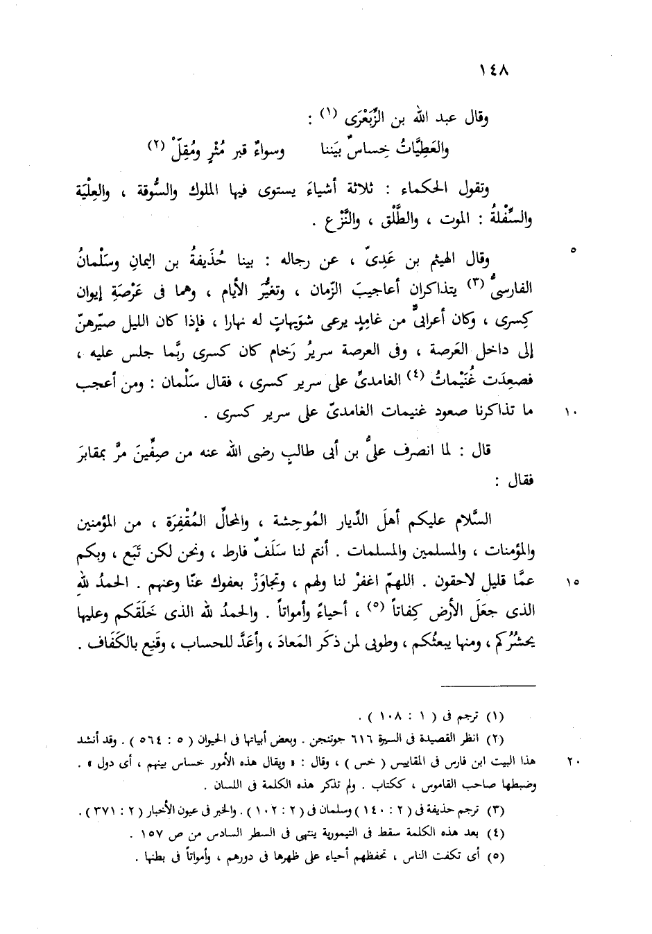 وقال الهيثم بن عدي عن رجاله بينا حذيفة بن اليمان وسلمان الفارسي يتذاكران أعاجيب الزمان وتغير الايام وهما في عرصة إيوان كسرى وكان أعرابي من غامد يرعى شويهات له نهارا فاذا كان الليل صيرهن الى داخل العرصة وفي العرصة سرير رخام كان كسرى ربما جلس عليه فصعدت غنيمات الغامدي على سرير كسرى فقال سليمان ومن أعجب ما تذاكرنا صعود غنيمات الغامدي على سرير كسرى