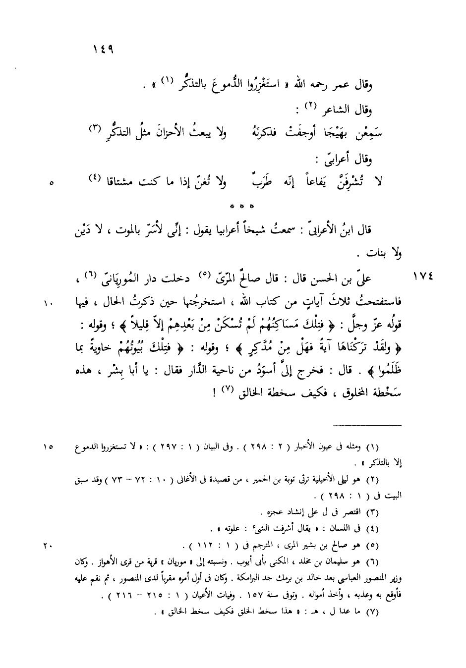 قال علي بن الحسن قال صالح المري دخلت دار المرياني فاستفتحت ثلاث آيات من كتاب الله استخرجتها حين ذكرت الحال فيها قوله ( فتلك مساكنهم لم تسكن من بعدهم إلا قليلا ) وقوله ( ولقد تركناها آية فهل من مدكر ) وقوله ( فتلك بيوتهم خاوية بما ظلموا ) قال فخرج الى أسود من ناحية الدار فقال يا أبا بشر هذا سخط المخلوق فكيف سخط الخالق@