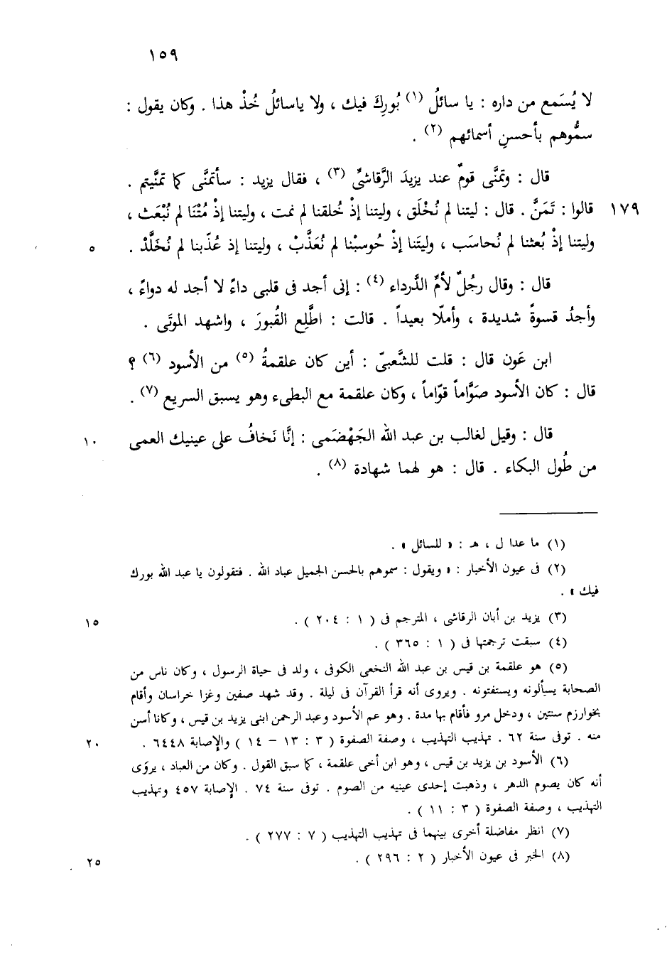 قال ابن عون قلت للشعبي اين كان علقمة بن الاسود قال كان الاسود قواما صواما وعلقمة مع البطيء وهو يسبق السريع