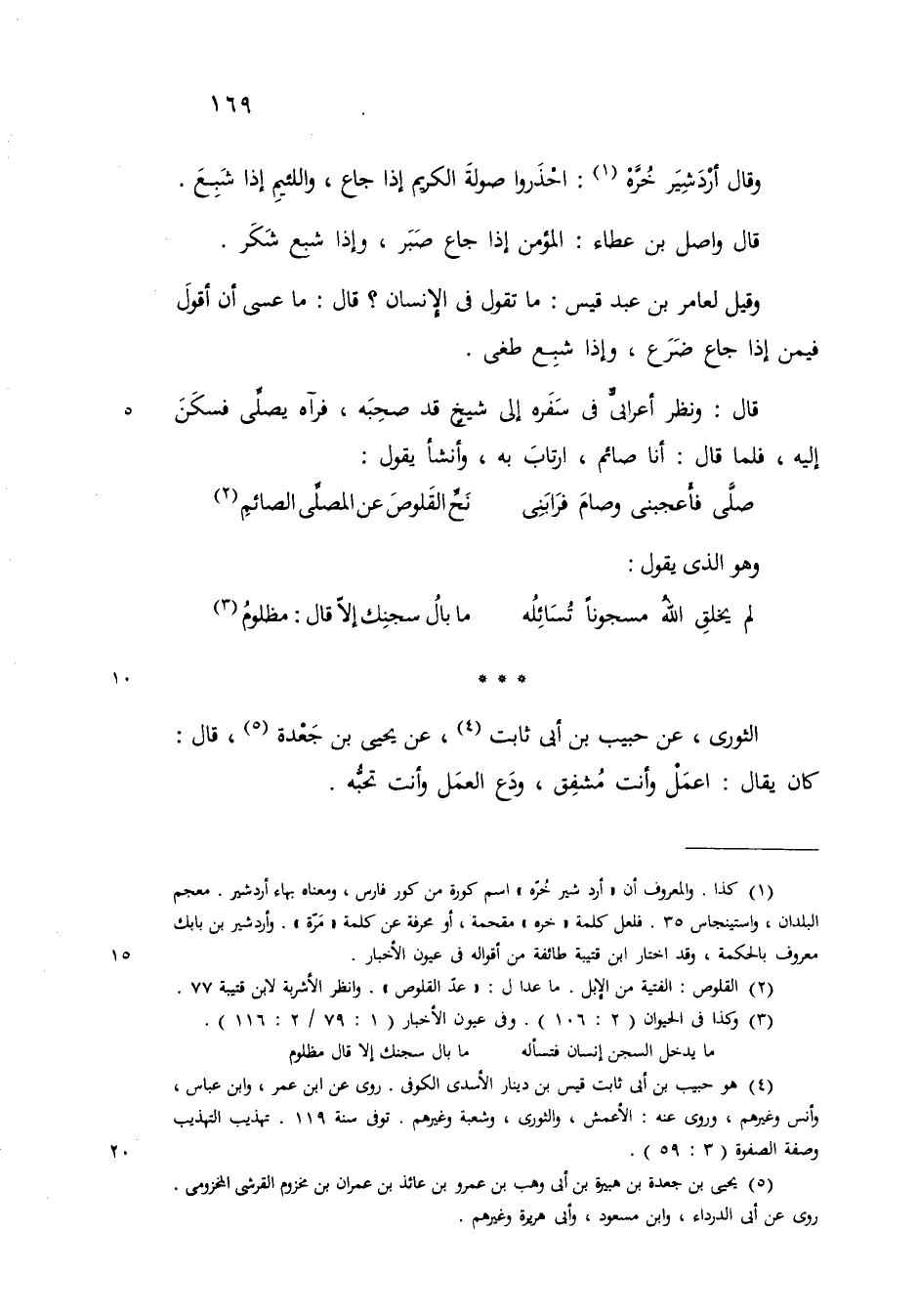 وقيل لعامر بن عبد قيس ما نقول في الانسان قال ما عسى أن أقول فيمن اذا جاع ضرع وإذا شبع طغى