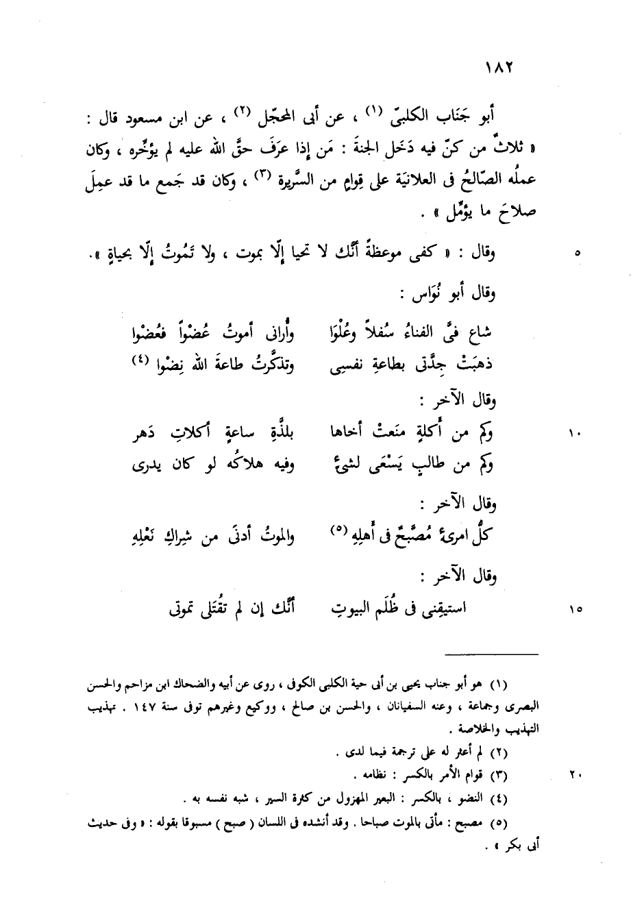 قال أبو جناب الكلبي عن أبي المحجل عن ابن مسعود ثلاث من كن فيه دخل الجنة من اذا عرف حق الله عليه لم يؤخره وكان عمله الصالح في العلانية على قوام من السريرة وكان قد جمع مع ما قد عمل صلاح ما يؤمله وقال كفى موعظة أنك لا تحيى الا بموت ولا تموت الا بحياة