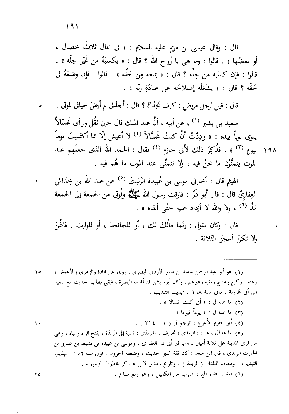 قال الهيثم اخبرنا موسى بن عبيدة الزيدي عن عبد الله بن خداش الغفاري قال قال ابو ذر فارقت رسول الله وقوتي من الجمعة الى الجمعة مد ولا والله لا أزداد عليه حتى ألقاه قال وكان يقول انما ما لك لك او للجائحة او للوارث فاغن ولا تكن اعجز الثلاثة@