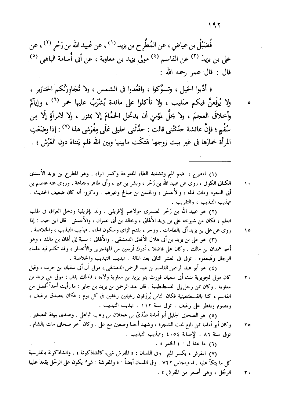 قال فضيل بن عياض عن المطرح بن يزيد عن عبد الله بن زحر عن علي ابن يزيد عن القاسم مولى يزيد بن معاوية عن ابي أمامة الباهلي قال عمر رضي الله تعالى عنه أدبوا الخيل وتسوكوا واقعدوا في الشمس ولا تجاورنكم الخنازير ولا يرفعن فيكم الصليب ولا تأكلوا على مائدة تشرب عليها الخمر وإياكم وأخلاق العجم ولا يحل لمؤمن ان يدخل الحمام إلا بمئزر ولا لامرأة ألا من سقم فان عائشة رضي الله تعالى عنها حدثتني قالت حدثني خليلي على مفرشي هذا قال اذا وضعت المرأةخمارها في غير بيت زوجها هتكت مابينها وبين الله فلم تناهى دون العرش@