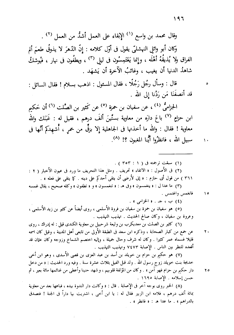 وكان ابو وائل النهشلي يقول في اول كلامه ان الدهر لا يذوق طعم الفراق ولا يذيقه اهله وانما ينغمسون في ليل ويطغون في نهار فيوشك شاهد الدنيا ان يغيب وغائب الآخرة ان يشهد وقال سأل رجل رجلا حاجة فقال له المسؤول اذهب بسلام فقال له السائل قد انصفنا من ردنا الى الله