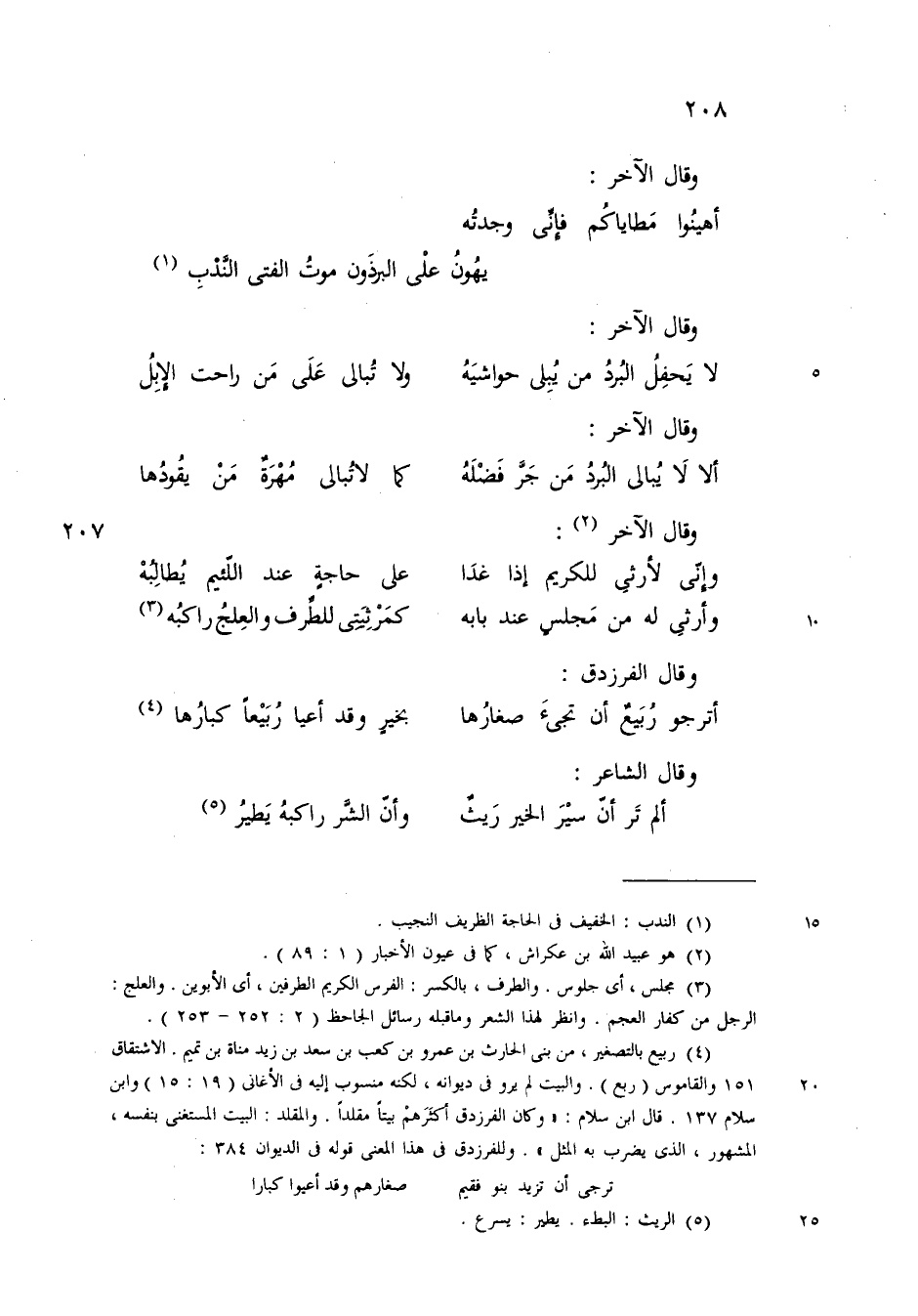 ( أهينوا مطاياكم فاني وجدته ... يهون على البردون موت الفتى الندب )