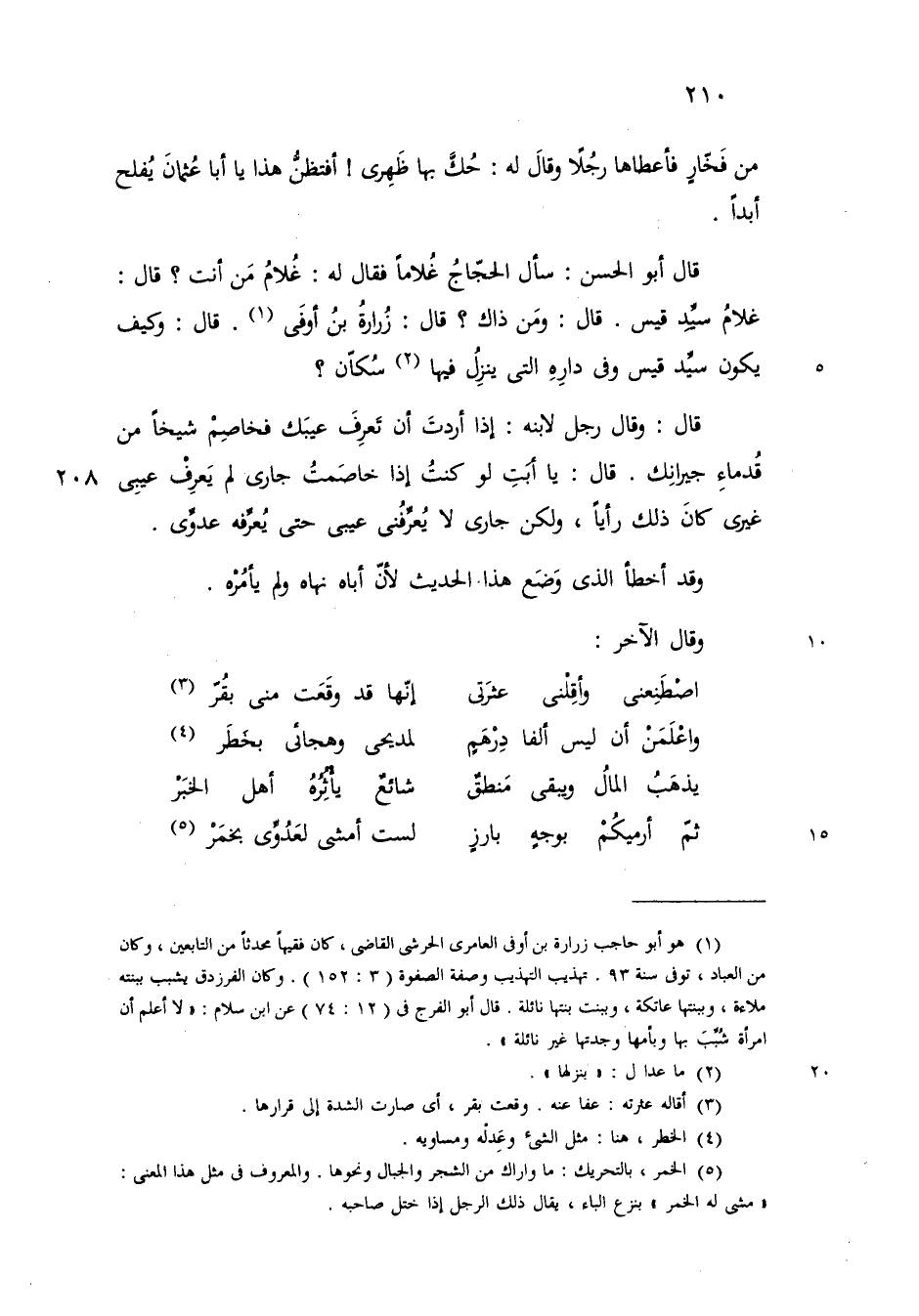 قال ابوالحسن سأل الحجاج غلاما فقال له غلام من أنت قال غلام سيد قيس قال ومن ذاك قال زرارة بن أوفي قال كيف يكون سيد قيس في داره التي ينزلها سكان