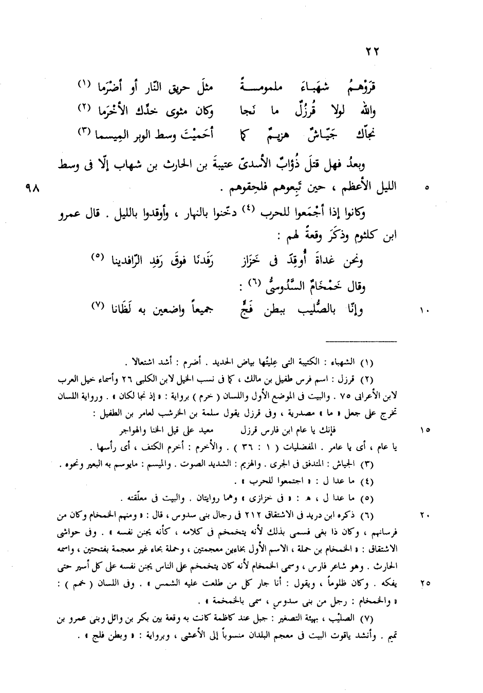 وبعد فهل قتل ذؤاب الاسدي عتيبة بن الحارث بن شهاب الا وسط الليل الاعظم حين تبعوهم فلحقوهم وكانوا اذا اجتمعوا للحرب دخنوا بالنهار وأوقدوا