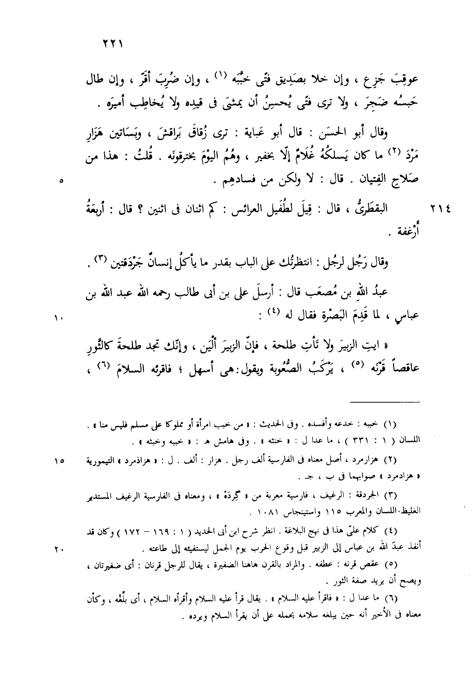 قال ابوالحسن قال ابو عباية ترى زقاق براقش وبساتين هزار مرد ماكان يسلكه غلام الا بخفير وهم اليوم تخترقونه قلت هذا من صلاح الفتيان قال لا ولكن من فسادهم