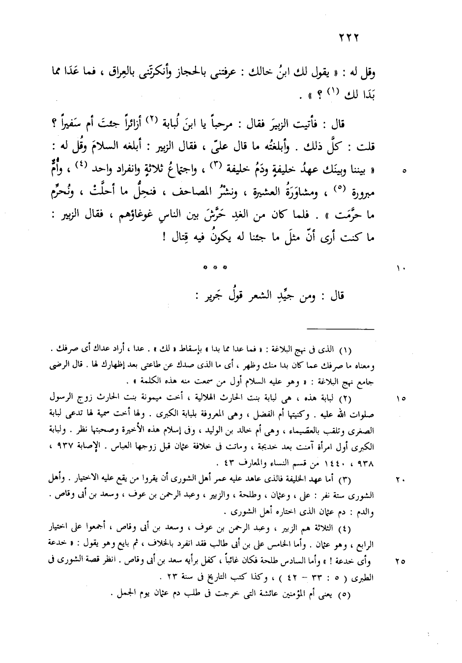 وقل له يقول لك ابن خالك عرفتني بالحجاز وأنكرتني بالعراق فما عدا مما بدا قال فأتيت الزبير فقال ما حبا يا ابن لبابة أزائرا جئت ام سفيرا قلت كل ذلك وأبلغته ما قال علي فقال الزبير أبلغه السلام وقل بيننا وبينك عهد خليفة ودم خليفة واجتماع ثلاثة وانفراد واحد وام مبرورة ومشاورة العشيرة ونشر المصاحف فتحل ما أحلت وتحرم ما حرمت فلما كان من الغد حرش بين الناس غوغاؤهم فقال الزبير ما كنت ارى ان مثل ما جئنا له يكون فيه قتال