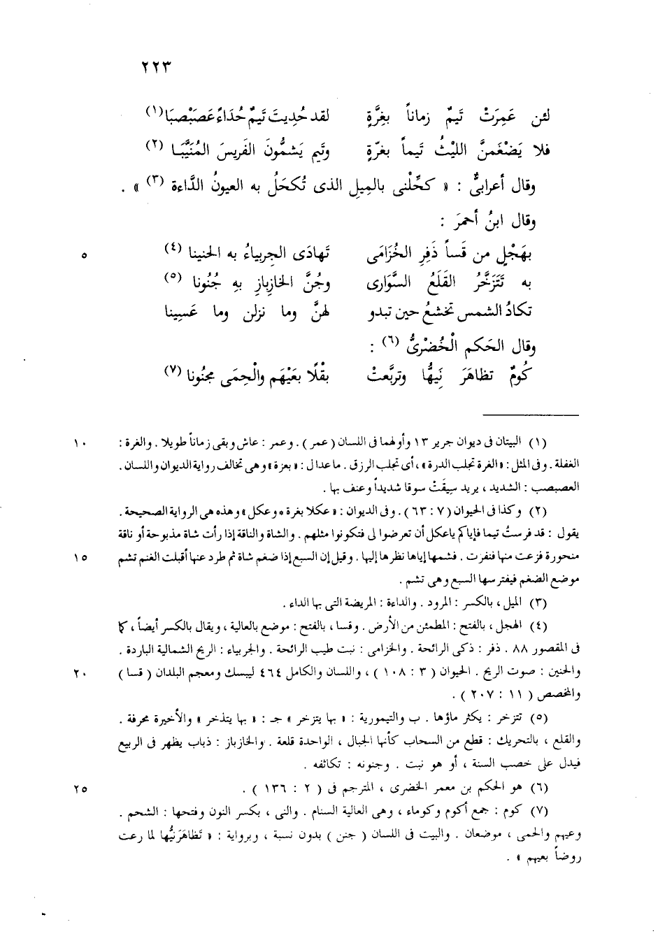 ( لئن عمرت تيم زمانا بعزة ... لقد حديت تيم حداء عصبصا )