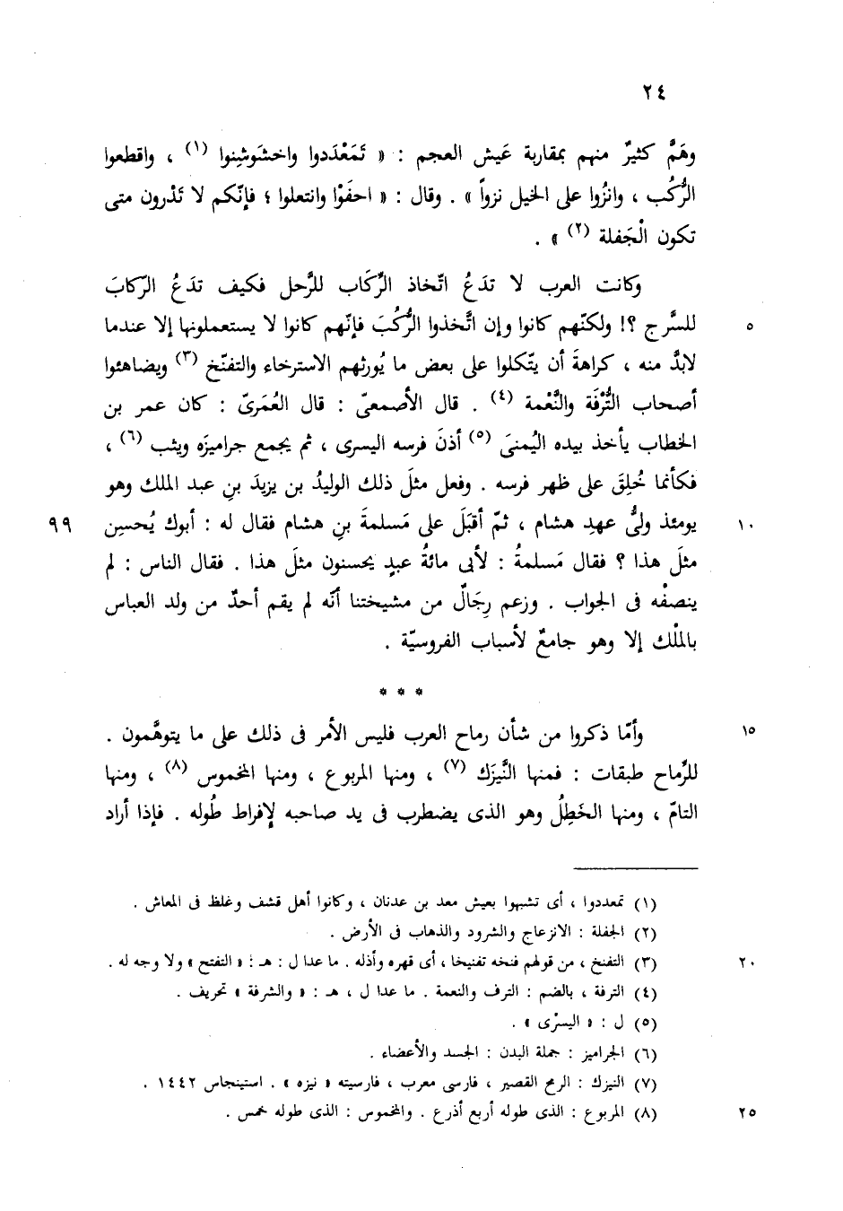 وهم كثير منهم بمقاربة عيش العجم تمعدوا واخشوشنوا واقطعوا الركب وانزوا علىالخيل نزوا وقال احفوا وانتعلوا فانكم لا تدرون متى تكون الجفلة