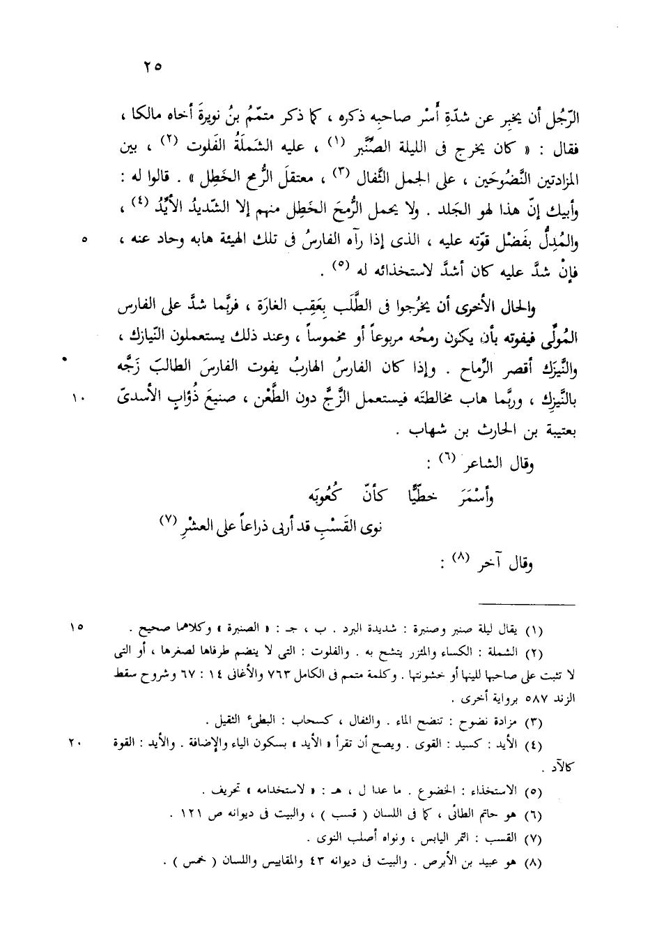 الرجل ان يخبر عن شدة أسر صاحبه ذكره كما ذكر متمم بن نويرة أخاه مالكا فقال كان يخرج في الليلة الصنبرة عليه الشملة الفلوت بين المزادتين النضوحين على الجمل الثفال معتقل الرمح الخطل قالوا له وأبيك ان هذا لهو الجلد ولا يحمل الرمح الخطل منهم الا الشديد الأيد والمدل بفضل قوته عليه الذي اذا رآه الفارس في تلك الهيبة هابه وحاد عنه فان شد عليه كان أشد لاستخدامه له والحال الاخرى ان يخرجوا في الطلب بعقب الفارة فربما شد على الفارس المولي فيفوته بأن يكون رمحه مربوعا او مخموسا وعند ذلك يستعملون النيازك والنيزك أقصر الرماح واذاكان الفارس الهارب يفوت الفارس الطالب زجه بالنيزك وربما هاب مخالطته فيستعمل الزج دون الطعن صنيع ذؤاب الاسدي بعتيبة بن الحارث بن شهاب وقال الشاعر