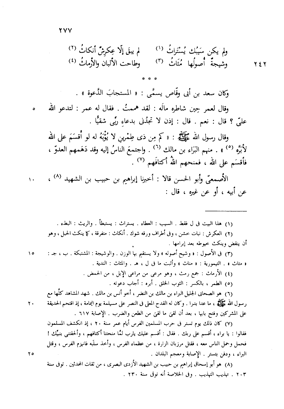 وكان سعد بن أبي وقاص يسمى المستجاب الدعوة وقال لعمر حين شاطره ماله لقد هممت فقال له عمر ان تدعو الله علي قال نعم قال إذا لا تجدني بدعاء ربي شقيا