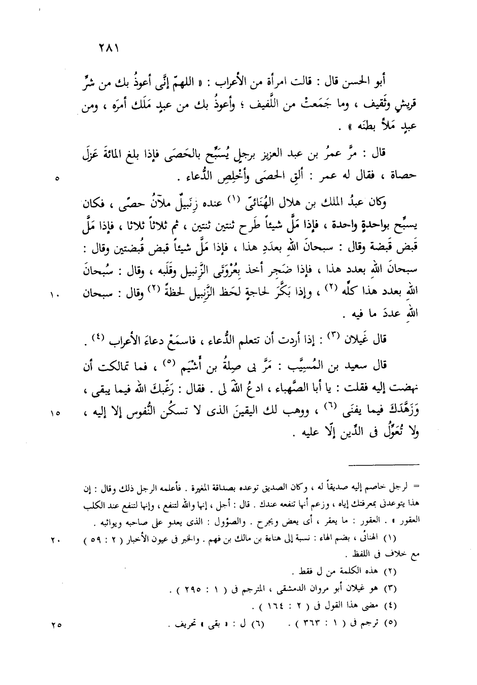 وكان عبدالملك بن هلال الهنائي عنده زنبيل ملآن حصى فكان يسبح بواحدة واحدة فاذا مل شيئا طرح ثنتين ثنتين ثم ثلاثا ثلاثا فاذا قبض قبضة وقال سبحان الله بعدد هذا واذا مل شيئا قبض قبضتين وقال سبحان الله بعدد هذا فاذا ضجر أخذ بعروتي الزنبيل وقلبه وقال الحمد لله بعدد هذا واذا بكر لحاجة لحظ الزنبيل وقال الحمد لله عدد ما فيه
