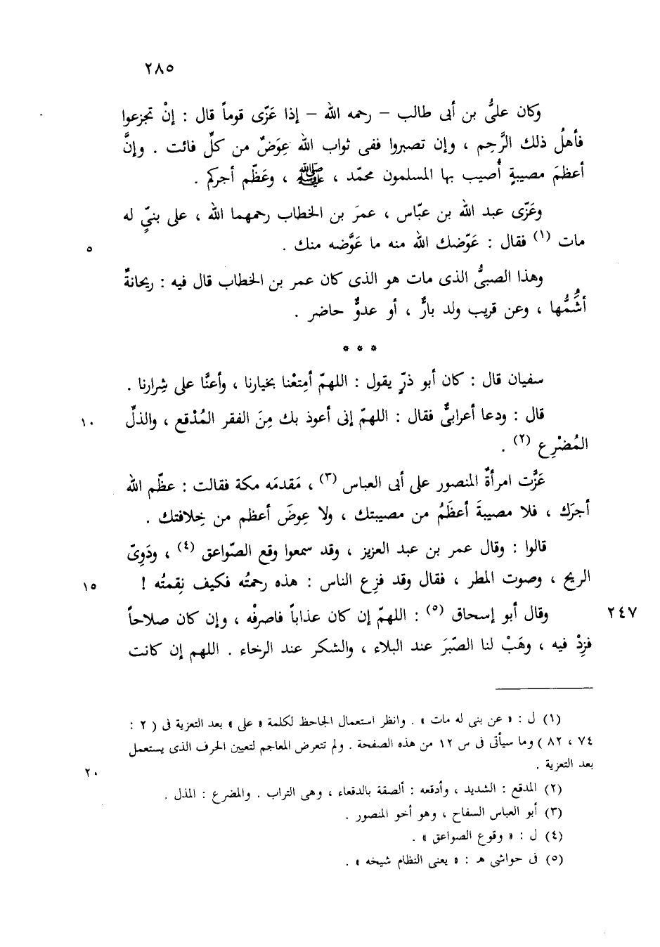 وكان علي بن أبي طالب رضي الله تعالى عنه اذاعزى قوما قال ان تجزعوا فأهل ذلك الرحم وان تصبروا ففي ثواب الله عوض من كل فائت وان أعظم مصيبة أصيب بها المسلمون محمد وعظم الله أجركم