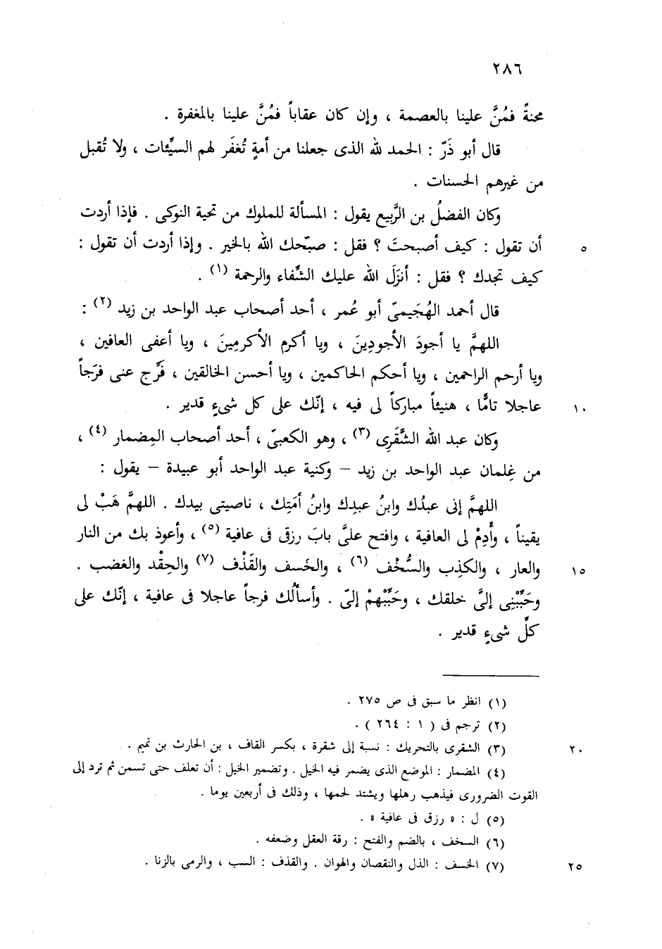 وكان عبد الله الشقري وهو الكعبي احد أصحاب المضمار من غلمان عبد الواحد بن زيد وكنيته ابومحمد وكنيته عبدالواحد ابو عبيدة يقول اللهم اني عبدك وابن عبدك وابن أمتك ناصيتي بيدك واللهم هب لي يقينا وأدم لي العافية وافتح علي باب رزقي في عافية وأعوذ بك من النار والعار والكذب والسخف والخسف والقذف والحقد والغضب وحببني الى خلقك وحببهم إلي وأسألك فرجا عاجلا في عافية أنك على كل شيء قدير@