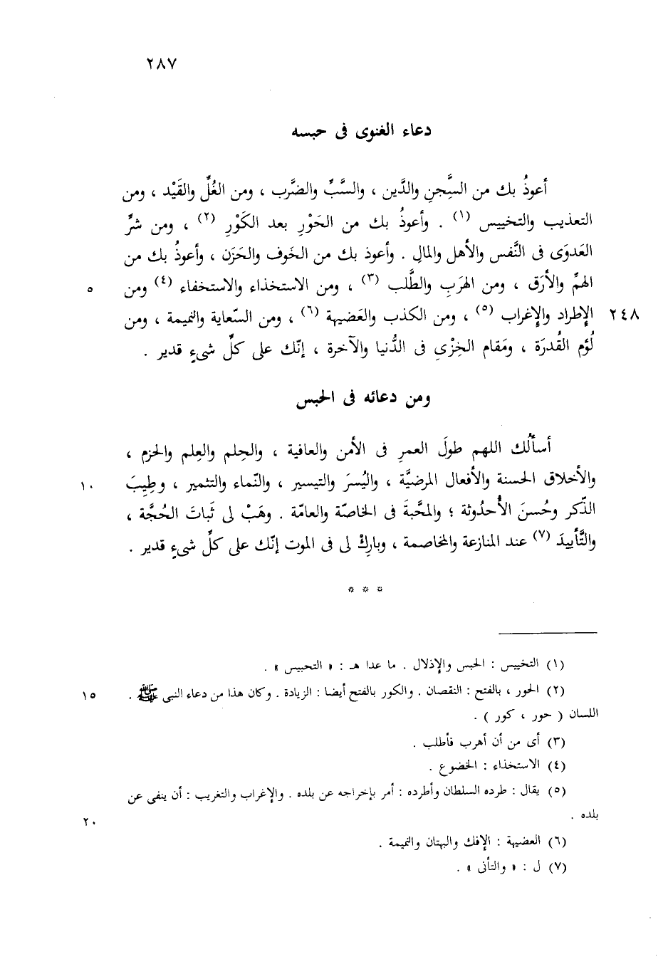 أعوذ بك من السجن والدين والسب والضرب ومن الغل والقيد ومن التعذيب والتجسيس وأعوذ بك من الحور بعد الكور ومن شر العدو في النفس والأهل والمال وأعوذ بك من الهم والأرق ومن الهرب والطلب ومن الاستخزاء والاستخفاء ومن الاطراد والاغراب ومن الكذب والعضيهة ومن السعاية والنميمة ومن لؤم القدرة ومقام الخزي في الدنيا والاخرة انك علىكل شيء قدير