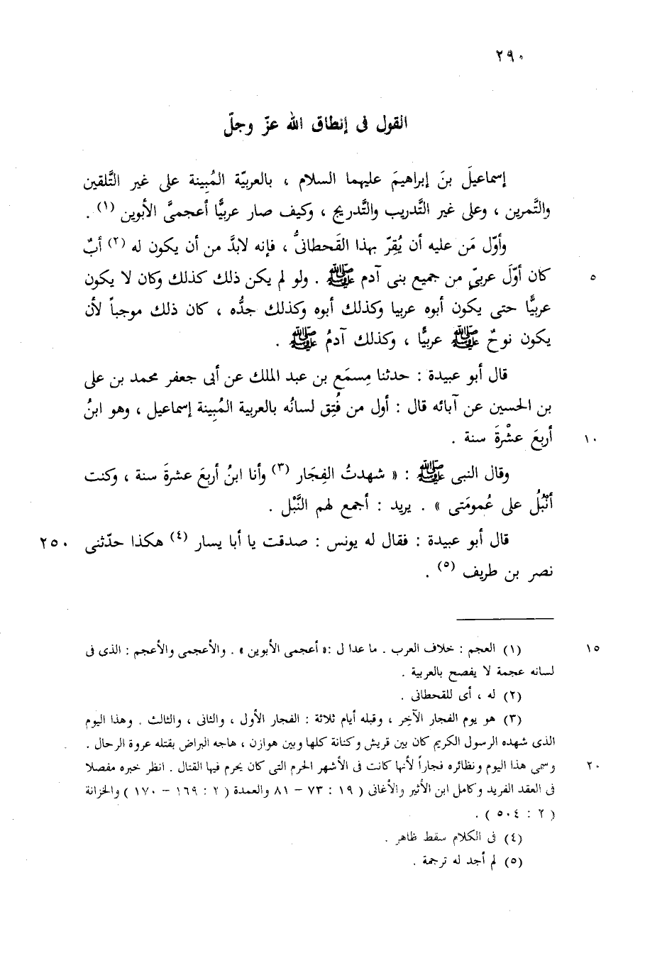 قال ابو عبيدة حدثنا مسمع بن عبد الملك عن أبي جعفر محمد بن علي بن الحسين عن آبائه قال اول من فتق لسانه بالعربية المبينة إسماعيل وهو ابن أربع عشرة سنة قال النبي شهدت الفجار وانا ابن أربع عشرة سنة وكنت أنبل على عمومتي يريد أجمع لهم النبل قال ابو عبيدة فقال له يونس صدقت يا أبا يسار هكذا حدثني نصر بن طريف@