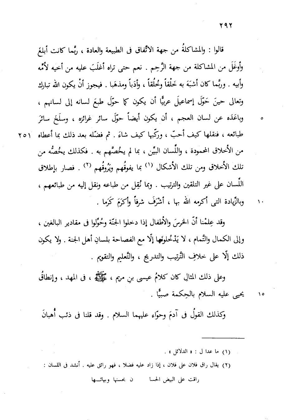 وقد علمنا ان الخرس والاطفال اذا أدخلوا الجنة وحولوا في مقادير البالغين والى الكمال والتمام لا يدخلونها الا مع الفصاحة بلسان اهل الجنة ولا يكون ذلك الا على خلاف الترتيب والتدريج والتعليم والتقويم وعلى ذلك المثال كان كلام عيسى بن مريم عليه السلام في المهد وانطاق يحيى عليه السلام بالحكمة صبيا وكذلك القول في ادم وحواء عليه السلام