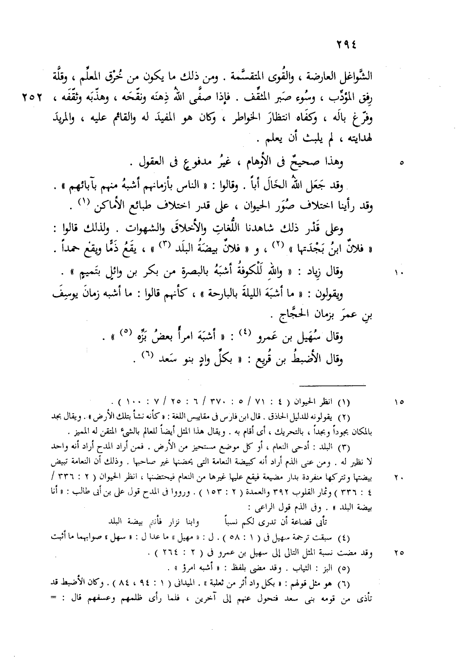 الشواغل العارضة والقوى المتقسمة ومن ذلك ما يكون من خرق المعلم وقلة رفق المؤدب وسوء صبر المثقف فاذا صفي الله ذهنه ونقحه وهذبه وثقفه وفرغ باله وكفاه انتظار الخواطر وكان هو المقيد له والقائم عليه والمريد لهدايته لم يلبث ان يعلم وهذا صحيح في الاوهام غير مدفوع في العقول وقد جعل الله الخال أبا وقالوا الناس بأزمانهم أشبه منهم بآبائهم