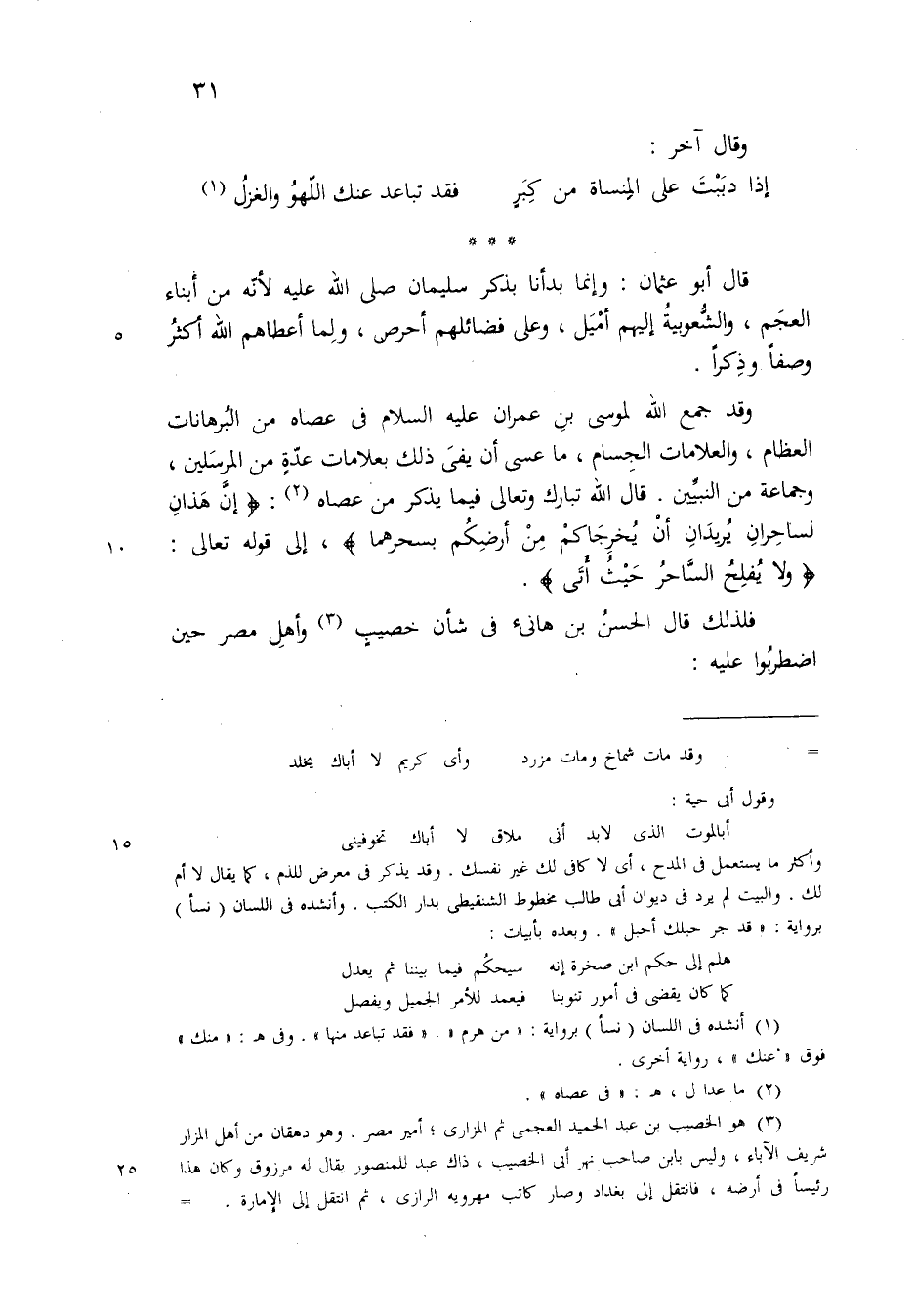 قال ابو عثمان وإنما بدأنا بذكر سليمان على نبينا لأنه من أنبياء العجم والشعوبية اليهم أميل وعلى فضائلهم أحرص ولما أعطاهم الله اكثر وصفا وذكرا وقد جمع الله لموسى بن عمران في عصاه من البرهانات العظام والعلامات الجسام ما عسى ان يفي ذلك بعلامات عدة من المرسلين وجماعة من النبيين قال الله تبارك وتعالى فيما يذكر في عصاه ( ان هذان لساحران يريدان ان يخرجاكم من أرضكم بسحرهما ) الى قوله ( ولا يفلح الساحر حيث أتى ) فلذلك قال الحسن بن هانىء في شأن خصيب وأهل مصر حين اضطربوا عليه@