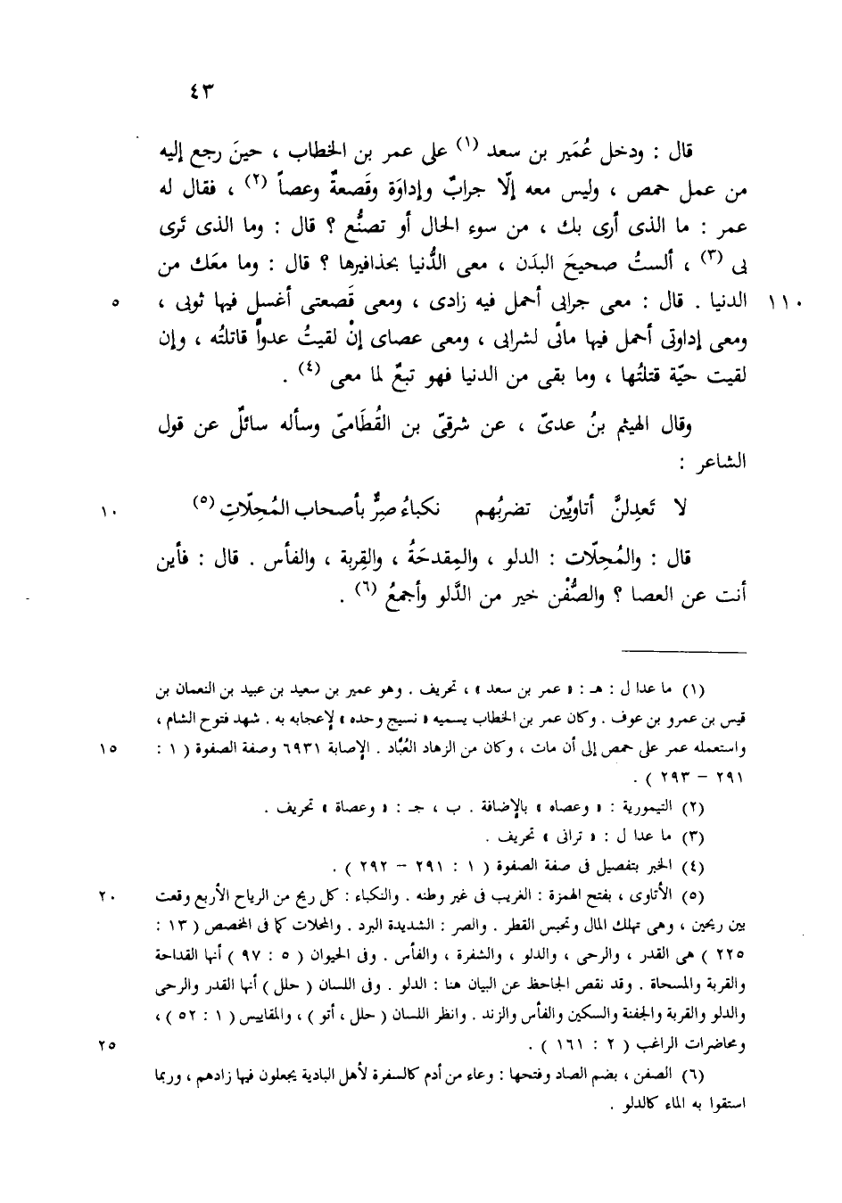 ودخل عمر بن سعد على عمر بن الخطاب حين رجع اليه من عمل حمص وليس معه إلا جراب واداوة وقصعة وعصاة فقال له عمر ما الذي ارى بك من سوء الحال ام تصنع قال وما الذي تراني أولست تراني صحيح البدن معي الدنيا بحذافيرها قال وما معك من الدنيا قال معي جرابي احمل فيه زادي ومعي قصعتي اغسل فيها ثوبي ومعي اداوتي احمل فيها مائي لشرابي ومعي عصاي ان لقيت حية قتلتها وما بقي من الدنيا تبع لما معي