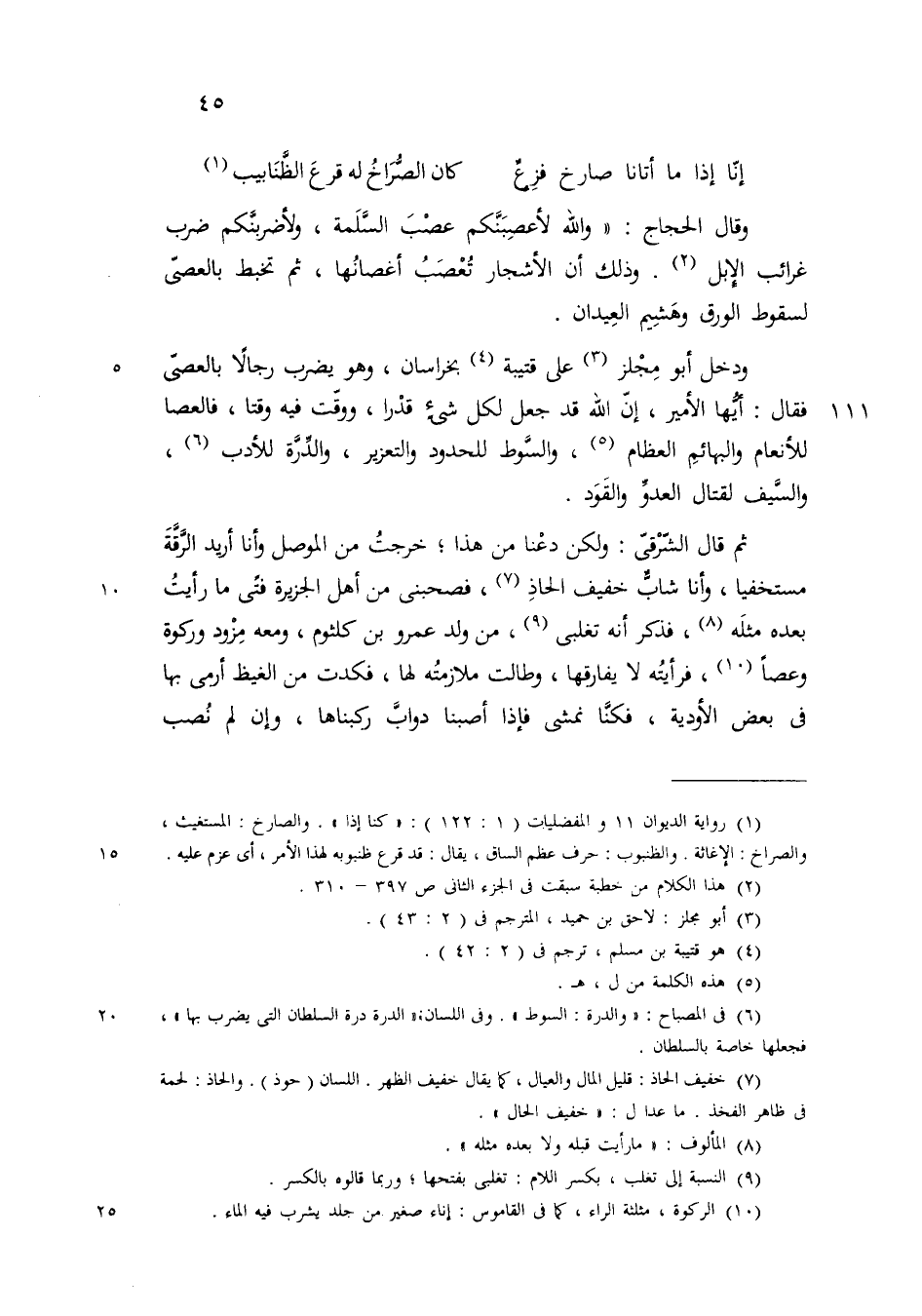 وقال الحجاج والله لأعصبنكم عصب السلمة ولأضربنكم ضرب غرائب الإبل وذلك لان الاشجار تعصب اغصانها ثم تخبط بالعصي لسقوط الورق وهشيم العيدان ودخل ابو مجلز على قتيبة بخراسان وهو يضرب رجالا بالعصي فقال ايها الامير ان الله قد جعل لكل شيء قدرا ووقت فيه وقتا فالعصي للأنعام والبهائم والسوط للحدود والتعزيز والدرة للأدب والسيف لقتال العدو والقود