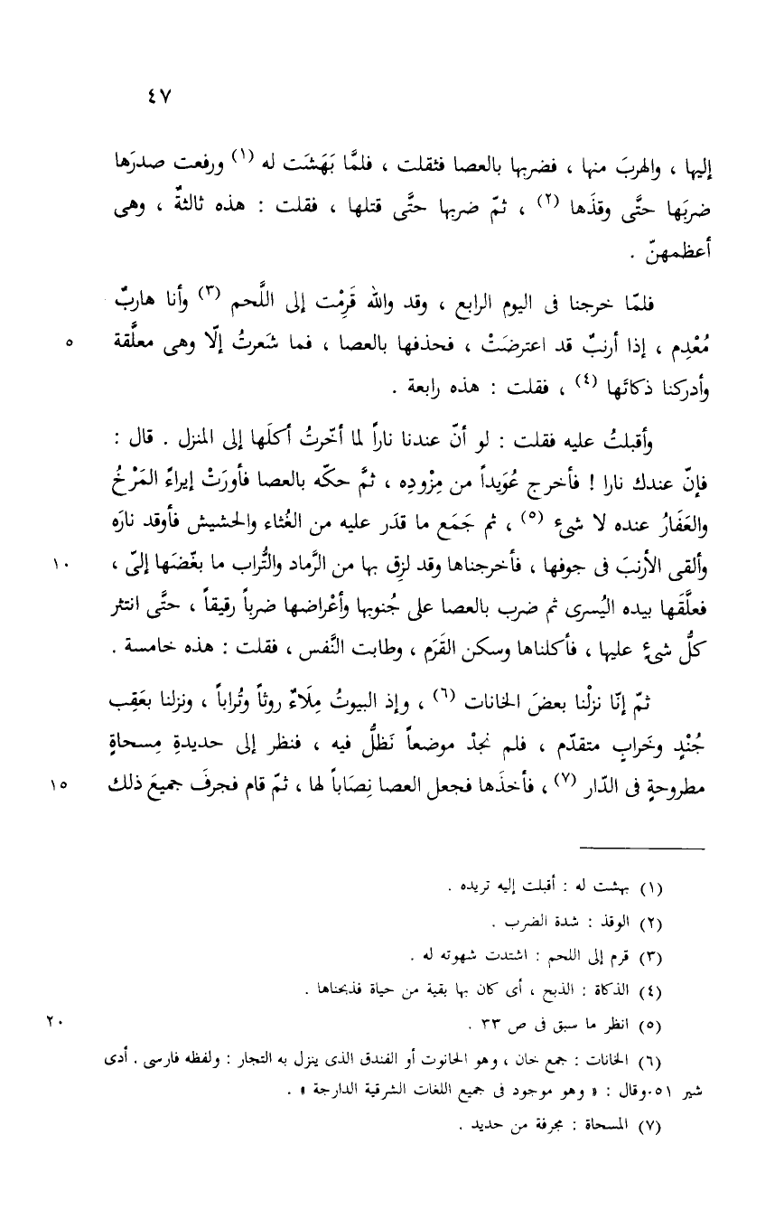 اليها والهرب منها فضربها بالعصا فثقلت فلما بهشت له ورفعت صدرها ضربها حتى وقذها ثم ضربها حتى قتلها قلت هذه ثالثة وهي أعظمهن فلمنا خرجنا في اليوم الرابع قرمت والله الى اللحم وانا هارب معدم اذا أرنب قد اعترضت فحذفها فما شعرت والله الا وهي معلقة وأدركنا ذكاتها فقلت هذه رابعة وأقبلت عليه فقلت له لو ان عندنا نارا لما أخرت أكلها الى المنزل قال فان عندك نارا فأخرج عويدا من مزوده ثم حكه بالعصا فأورت ايراء ألمرخ والعقار عنده لا شيء ثم جمع ما قدر عليه من الغثاء والحشيش وأوقد ناره وألقي الارنب في جوفها فاخرجناها وقد لزق بها من الرماد والتراب ما نغصها الي فعلقها بيده اليسرى ثم ضرب بالعصا على جنوبها وأعراضها ضربا رقيقا حتى انتثر كل شيء عليها فأكلناها وسكن القرم وطابت النفس فقلت هذه خامسة ثم إنا نزلنا ببعض الخانات واذا البيوت ملأى روثا وترابا ونزلنا بعقب جند وخراب متقدم فلم نجد موضعا نظل فيه فنظر الى حديدة مسحاة مطروحة في الدار فأخذها فجعل العصا نصابا لها ثم قام فجرف جميع ذلك@