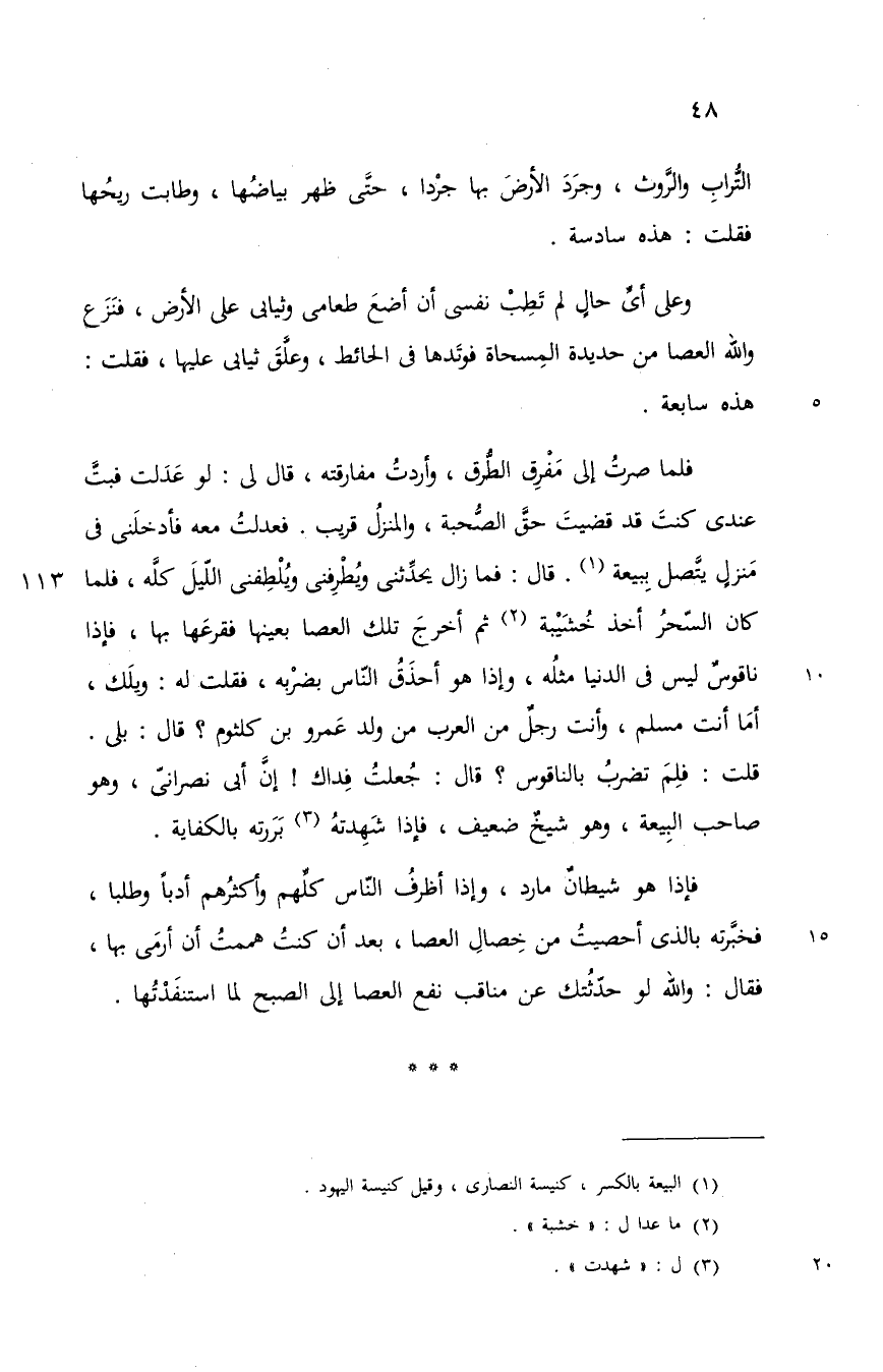 الروث والتراب وجرد الارض بها جردا حتى ظهر بياضها وطابت ريحها فقلت هذه سادسة وعلى اي حال لم تطب نفسي ان اضع طعامي وثيابي على تلك الارض فنزع و الله العصا من حديد المسحاة فوتدها في الحائط وعلق ثيابي عليها فقلت هذه سابعة فلما صرت الى مفرق الطرق وأردت مفارقته قال لي لو عدلت معي فبت عندي كنت قد قضيت حق الصحبة والمنزل قريب فعدلت معه فأدخلني في منزل يتصل ببيعه قال فما زال يحدثني ويطرفني ويلطفني الليل كله فلما كان السحر أخذ خشبة ثم اخرج تلك العصا بعينها