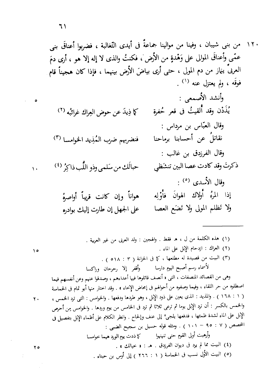 من بني شيبان - وفينا من موالينا جماعة - في أيدي التغالبة فضربوا أعناق بني عمي وأعناق الموالي على وهدة من الارض فكنت والذي لا إله الا هو أرى دم العربي ينماز من دم الموالي حتى أرى بياض الارض بينهما فاذا كان هجينا قام فوقه ولم يعتزل وأنشد الاصمعي