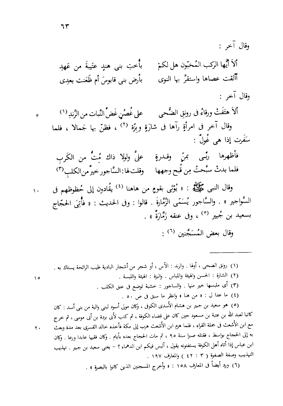 وقال النبي ( يؤتى بقوم من ههنا يقادون الىحظوظهم في السواجير ) والساجور يسمى الزمارة قالوا وفي الحديث فأتى الحجاج بسعيد بن