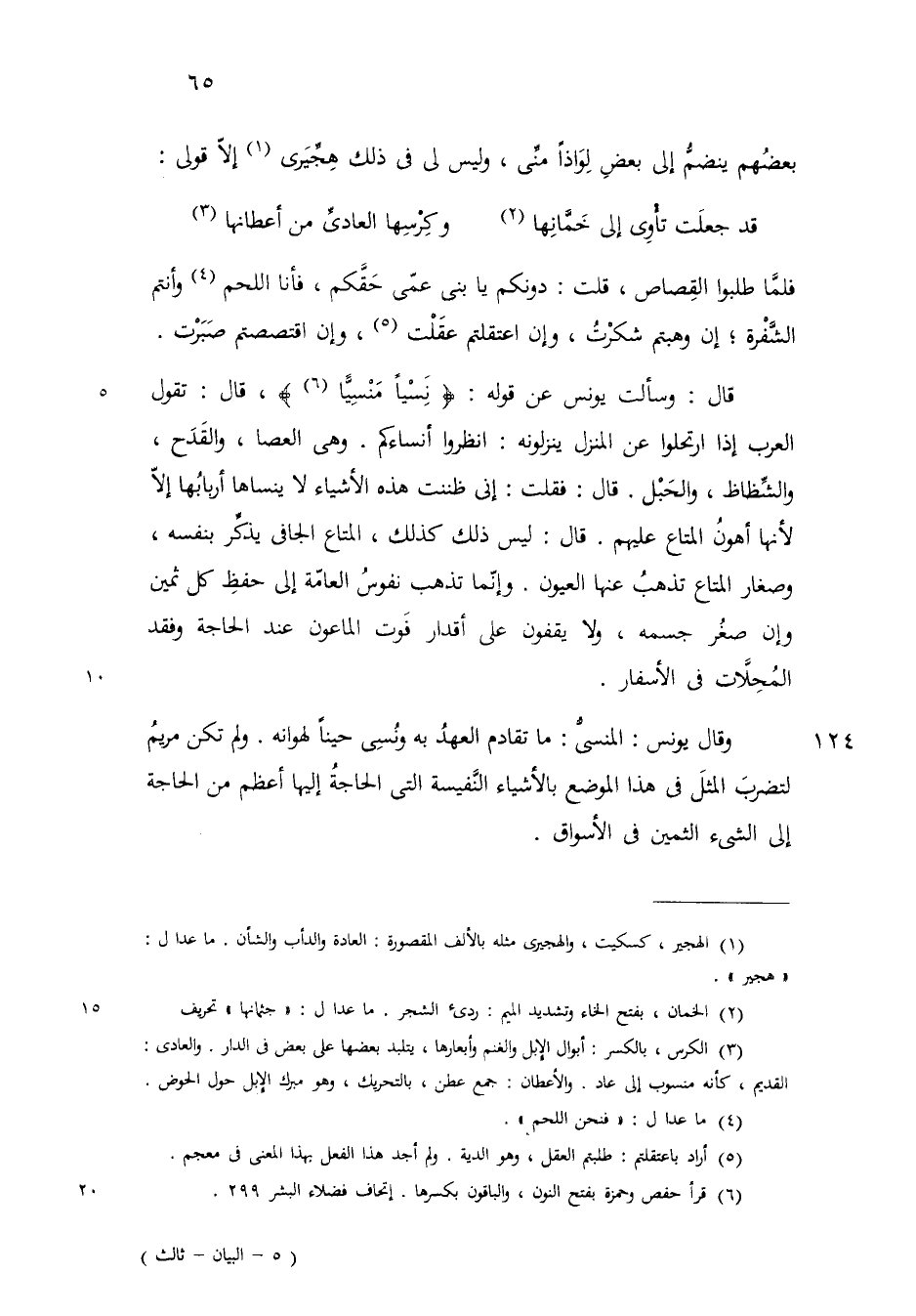 قال سألت يونس عن قوله نسيا منسيا قال تقول العرب اذا ارتحلوا عن المنزل ينزلونه أنظروا الى أنسائكم وهي العصا والقدح والشظاظ والحبل قال فقلت اني ظننت ان هذه الأشياء لا ينساها أربابها الا لانها أهون المتاع عليهم قال ليس ذلك كذلك والمتاع الجافي يذكر بنفسه وصغار المتاع تذهب عنها العيون وانما تذهب نفوس العامة الىحفظ كل شيء ثمين وان صغر جسمه ولا يقفون علىأقدار فوت الماعون عند الحاجة وفقد المحلات في الاسفار وقال يونس المنسي ما تقادم العهد به ونسي حينا لهوانه ولم تكن مريم لتضرب المثل في هذا الموضع بالاشياء النفسية التي الحاجة اليها أعظم من الحاجة الى الشيء الثمين في الاسواق@
