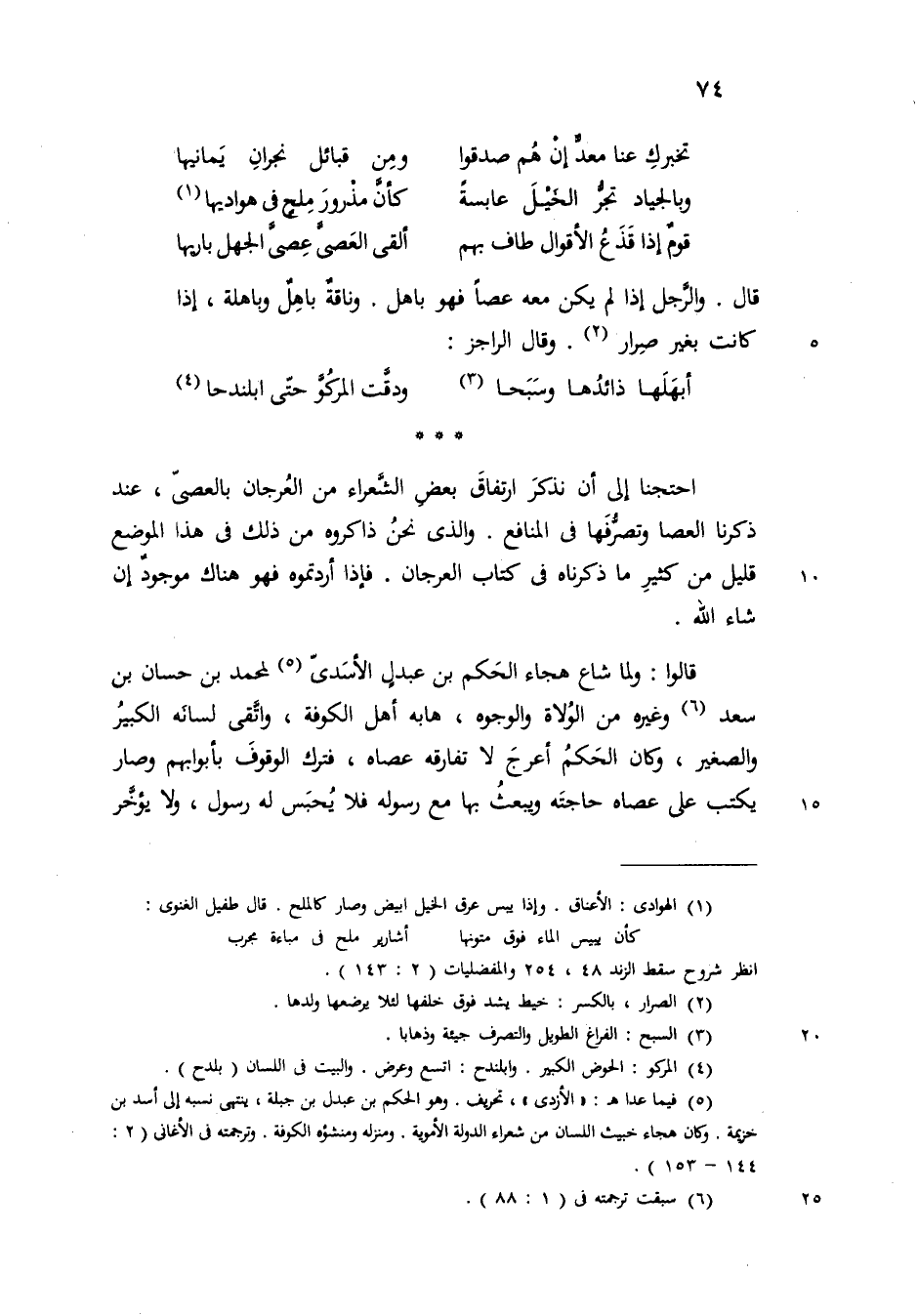 احتجنا ان نذكر ارتفاق بعض الشعراء من العرجان بالعصي عند ذكر العصا وتصرفها في المنافع والذي نحن ذاكروه من ذلك في هذا الموضع قليل من كثير مما ذكرناه في كتاب العرجان فان أردتموه فهو هناك موجود ان