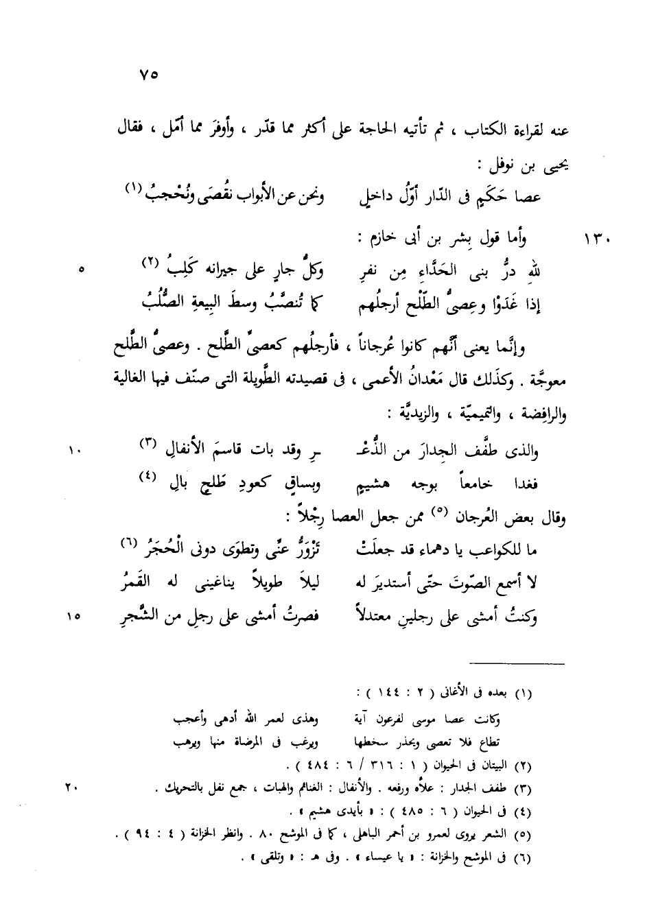 وانما يعني أنهم كانوا عرجا فأرجلهم كعصي الطلح وعصي الطلح معوجة وكذلك قال معدان الاعمى في قصيدته الطويلة التي وصف فيها الغالية والرافضة والتميمية والزيدية