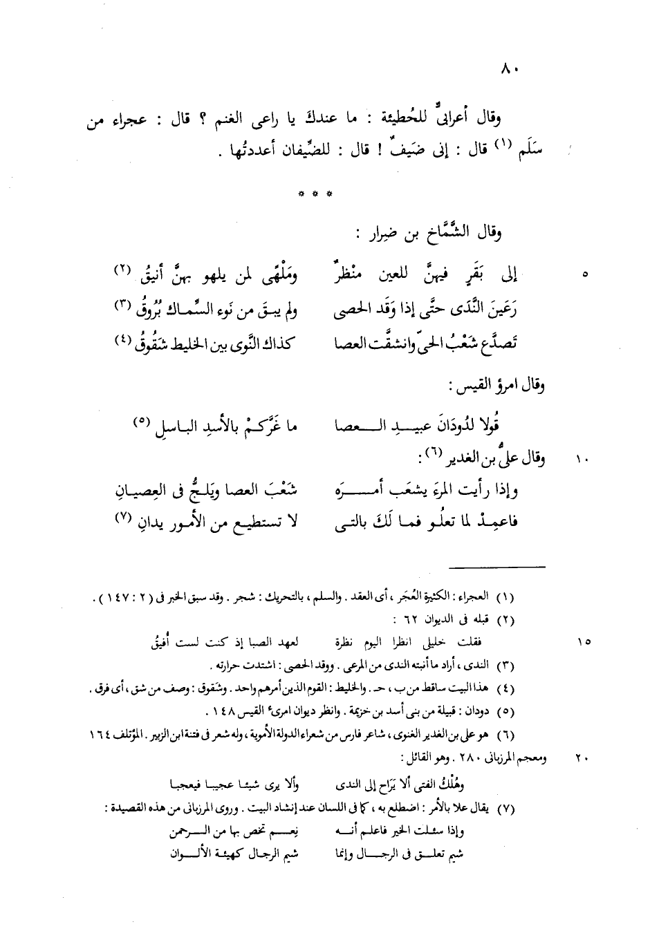 وقال اعرابي للحطيئة ما عندك يا راعي الغنم قال عجراء من سلم قال اني ضيف قال للضيفان أعددتها وقال الشماخ بن ضرار