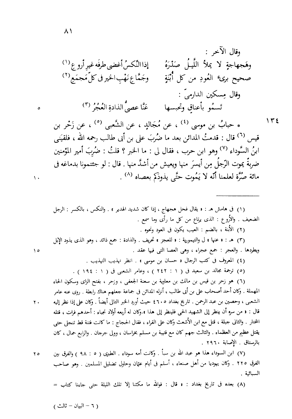 قال حباب بن موسى عن مجالد عن الشعبي عن جرير بن قيس قدمت المدائن بعد ما ضرب علي بن أبي طالب كرم الله تعالى وجهه فلقيني ابن السوداء وهو ابن حرب فقال لي ما الخبر فقلت ضرب أمير المؤمنين ضربة يموت الرجل من ايسر منها ويعيش من أشد منها قال لو جئتمونا بدماغه في مائة صرة لعلمنا انه لا يموت حتى يذودكم بعصاه @