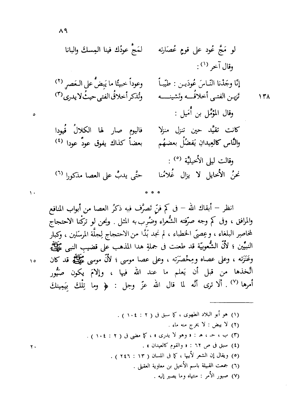 أنظر ابقاك الله في كم فن تصرف فيه ذكرالعصا من ابواب المنافع والمرافق وفي كم وجه صرفه الشعراء وضرب به المثل ونحن لو تركنا الاحتجاج لمخاصر البلغاء وعصي الخطباء لم نجد بدا من الاحتجاج لجلة المرسلين وكبار النبيين لان الشعوبية قد طعنت في جملة هذا المذهب علىقضيب النبي وعنزته وعلى عصاه ومخصرته وعلى عصا موسى لان موسى عليه السلام قد كان اتخذها من قبل ان يعلم ما عند الله فيها والى ما يكون صيور امرها ألا ترى انه لما قال الله عز و جل ( وما تلك بيمينك@