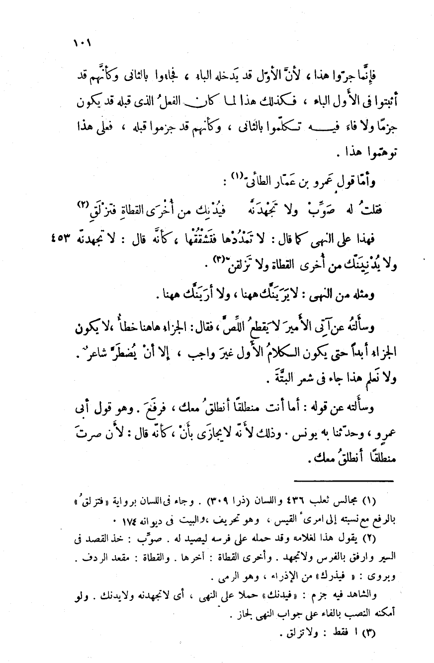 وسألته عن آتي الأمير لا يقطع الِّصَّ، فقال: الجزاء ها هنا خطأ، لا يكون الجزاء أبداً حتى يكون الكلام الأول غير واجب، إلا أن يضطرَّ شاعرٌ. ولا نعلم هذا جاء في شعر البتَّة.
