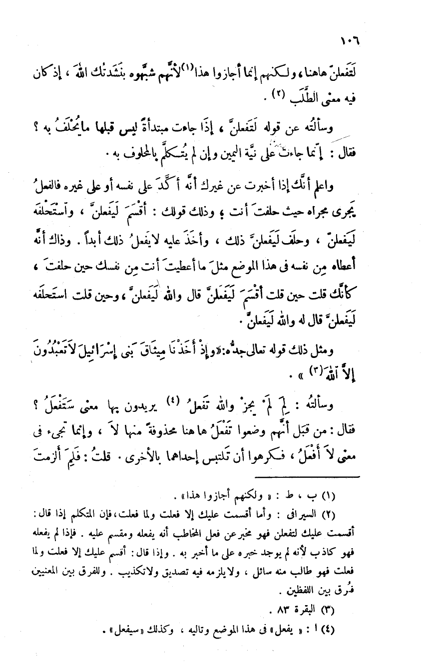 وسألته: لِمَ لَم يجز والَّله تفعل يريدون بها معنى ستفعل؟ فقال: من قبل أنَّهم وضعوا تفعل ها هنا محذوفة منها لا، وإنما تجيء في معنى لا أفعل، فكرهوا أن تلتبس إحداهما بالأخرى. فقلت: فلم ألزمت
