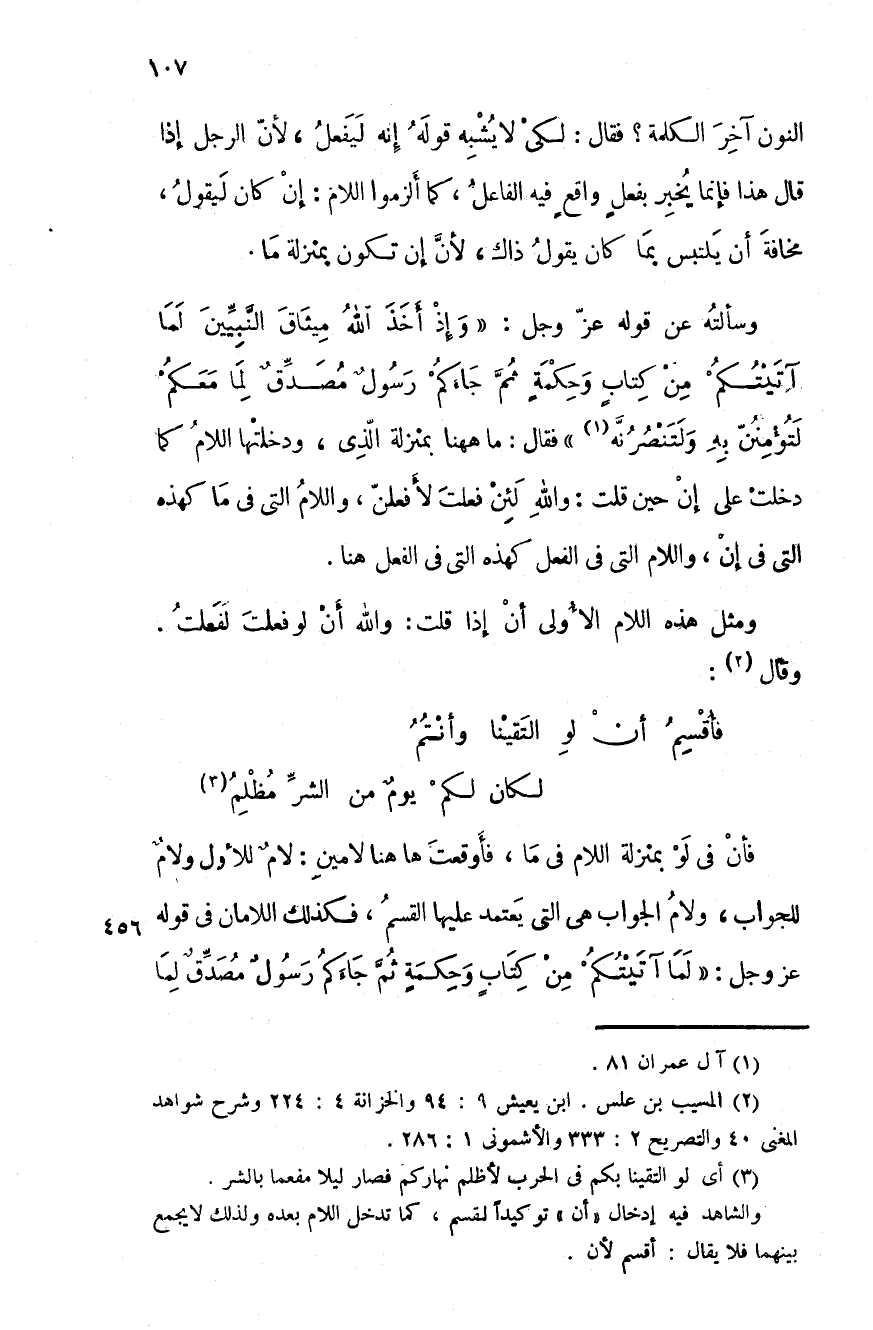 وسألته عن قوله عز وجل: " وإذ أخذ الَّله ميثاق النَّبييِّن لما آتيتكم من كتابٍ وحكمةٍ ثمَّ جاءكم رسول مصدِّق لما معكم لتؤمنن به ولتنصرنَّه " فقال: ما ههنا بمنزلة الذي، ودخلتها اللام كما دخلت على إن حين قلت: والله لئن فعلت لأفعلن، واللام التي في ما كهذه التي في إن، واللام التي في الفعل كهذه التي في الفعل هنا.