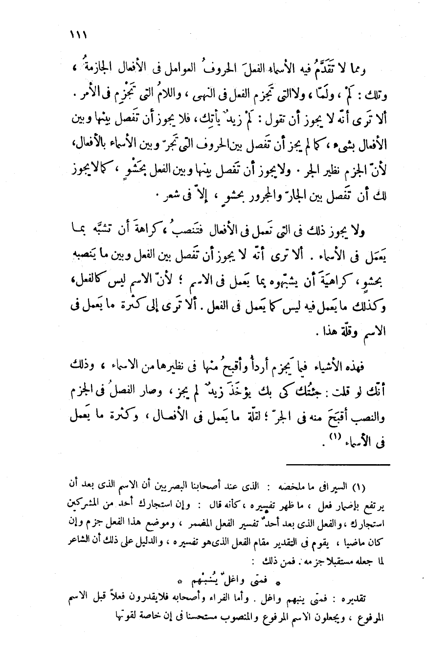 ولا يجوز ذلك في التي تعمل في الأفعال فتنصب، كراهة أن تشبَّه بما يعمل في الأسماء. ألا ترى أنه لا يجوز أن تفصل بين الفعل وبين ما ينصبه بحشوٍ، كراهية أن يشبهوه بما يعمل في الاسم؛ لأن الاسم ليس كالفعل، وكذلك ما يعمل فيه ليس كما يعمل في الفعل. ألا ترى إلى كثرة ما يعمل في الاسم وقلة هذا.