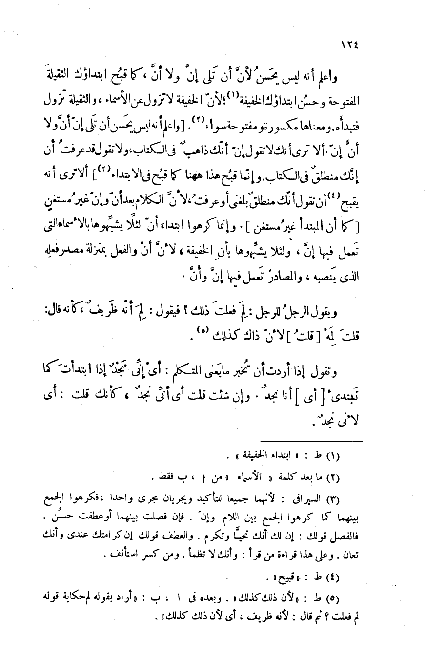 واعلم أنه ليسس يحسن لأنَّ أن تلي إنَّ ولا أن كما قبح ابتداؤك الثقيلة المفتوحة وحسن ابتداؤك الخفيفة؛ لأن الخفيفة لا تزول عن الأسماء، والثقيلة تزول فتبدأه. ومعناها مكسورة ومفتوحة سواء. واعلم أنه ليس يحسن أن تلي إن أنَّ ولا أنَّ إن. ألا ترى أنك لا تقول إن أنك ذاهبٌ في الكتاب، ولا تقول قد عرفت أ، إنِّك منطلقٌ في الكتاب. وإنما قبح هذا ههنا كما قبح في الابتداء، ألا ترى أنه يقبح أن تقول أن تقول أنك منطلقٌ بلغني أو عرفت، لأنَّ الكلام بعد أن وإن غير مستغنٍ كما أن المبتدأ غير مستغن. وإنما كرهوا ابتداء أن لئَّلا يشبِّهوها بالأسماء التي تعمل فيها إنَّ، ولئلا يشِّبهوها بأن الخفيفة، لأنَّ أن والفعل بمنزلة مصدر فعله الذي ينصبه، والمصادر تعمل فيها إن وأنَّ.