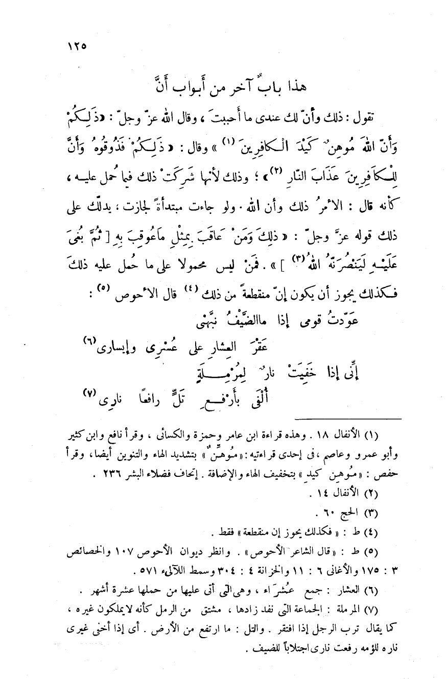 تقول: ذلك وأن لك عندي ما أحببت، وقال الَّله عز وجل: " ذلكم وأن الَّله موهن كيد الكافرين " وقال: " ذلكم فذوقوه وأنَّ للكافرين عذاب النار "؛ وذلك لأنها شركت ذلك فيما حمل عليه، كأنه قال: الأمر ذلك وأن الَّله. ولو جاءت مبتدأةً لجازت، يدلك على ذلك قوله عزَّ وجل: " ذلك ومن عاقب بمثل ما عوقب به ثمَّ بغي عليه لينصرنه الَّله. فمن ليس محمولاً على ما حمل عليه ذلك فكذلك يجوز أن يكون إن منقطعةً من ذلك قال الأحوص: