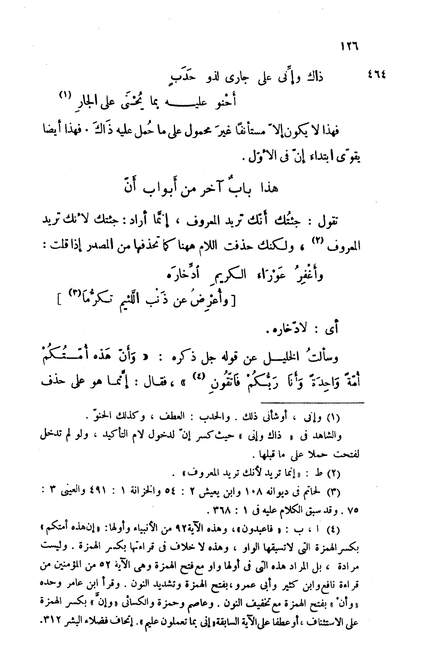 وسألت الخليل عن قوله جل ذكره: " وإن هذه أمتكم أمة واحدة وأنا ربُّكم فاتقون "، فقال: إنَّما هو على حذف